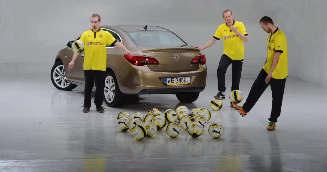 Prawie jak w telewizyjnej reklamie – Opel Astra sedan i piłkarskie trio w barwach Borussi Dortmund.