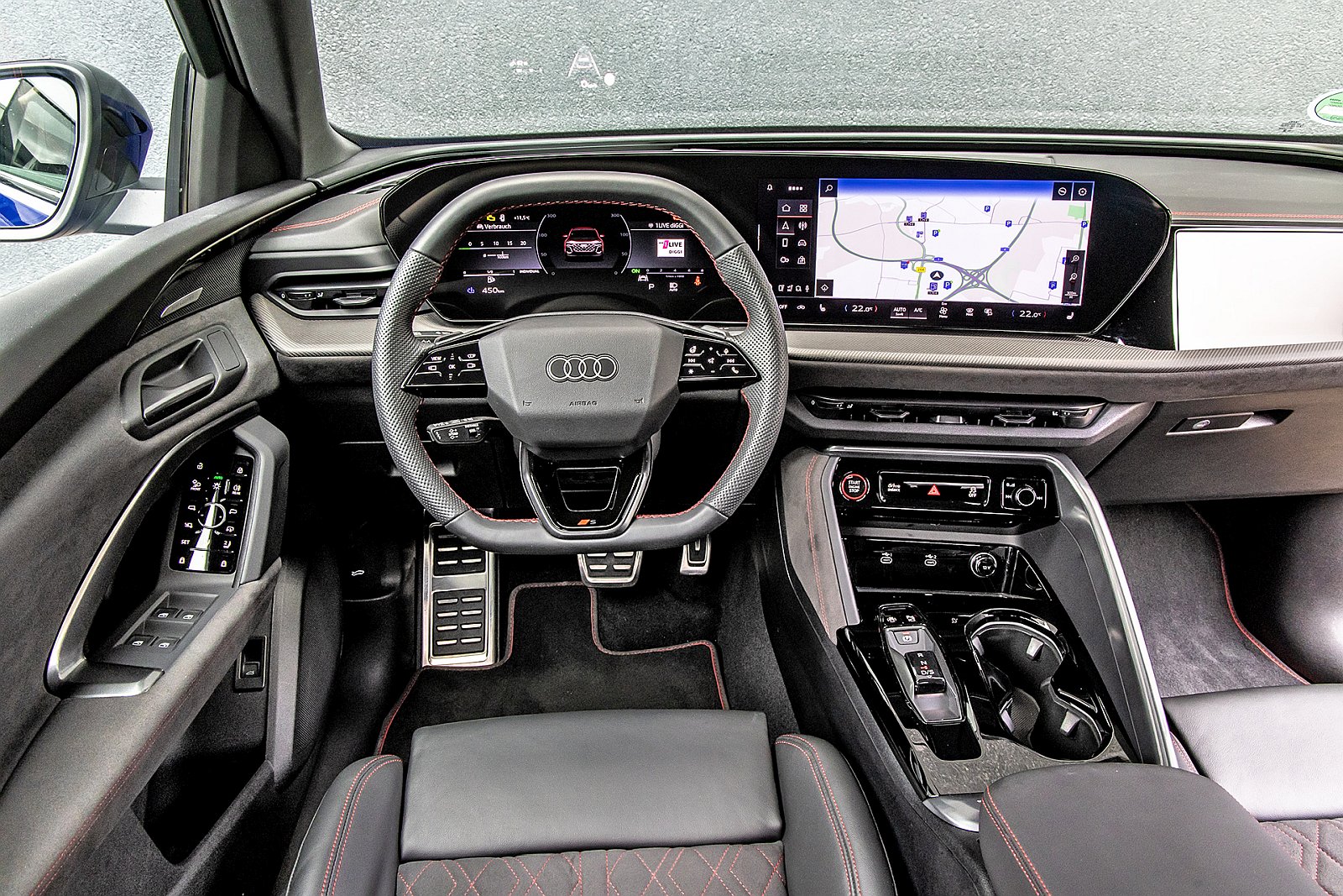 Typowy dla nowych modeli Audi masywny kokpit i duże ilości połyskliwych oraz twardych plastików. Czytelne instrumenty, przyjazny system operacyjny z dobrą obsługą głosową, całkiem użyteczne gładziki na kierownicy.
