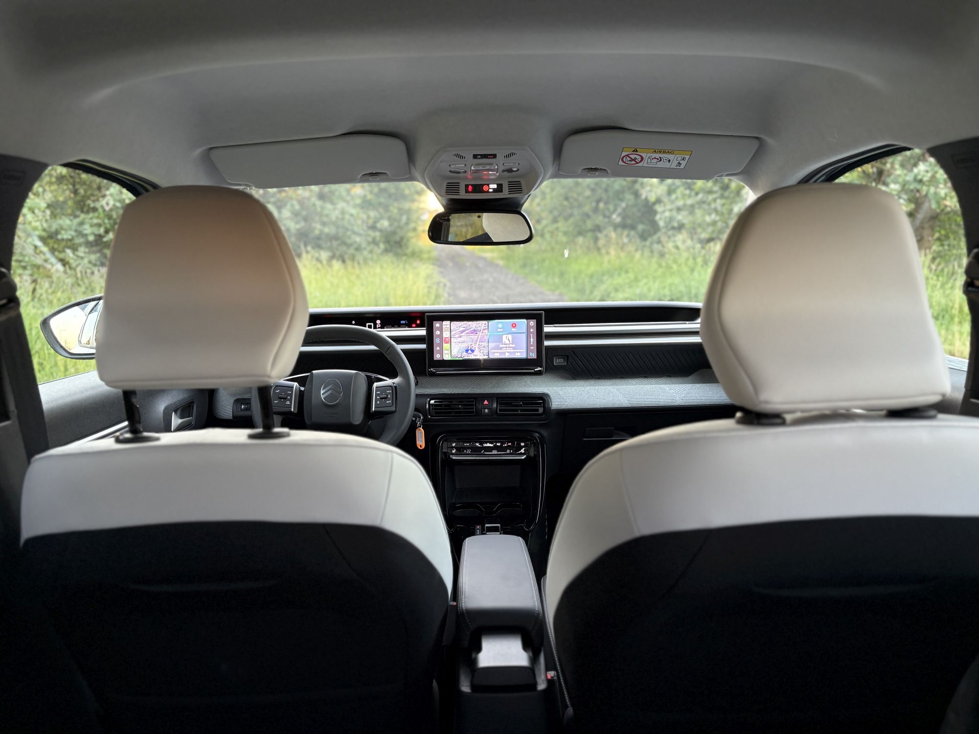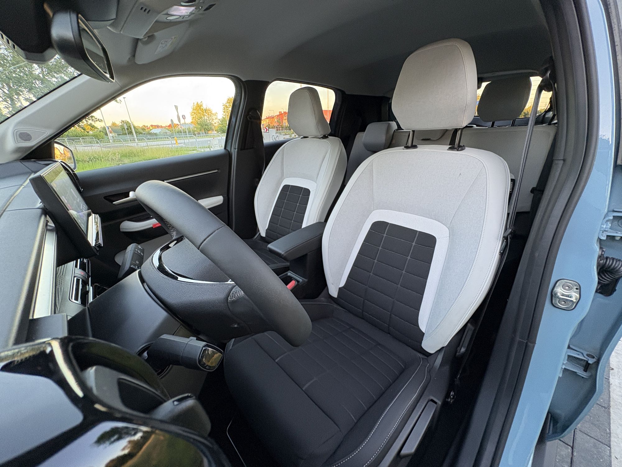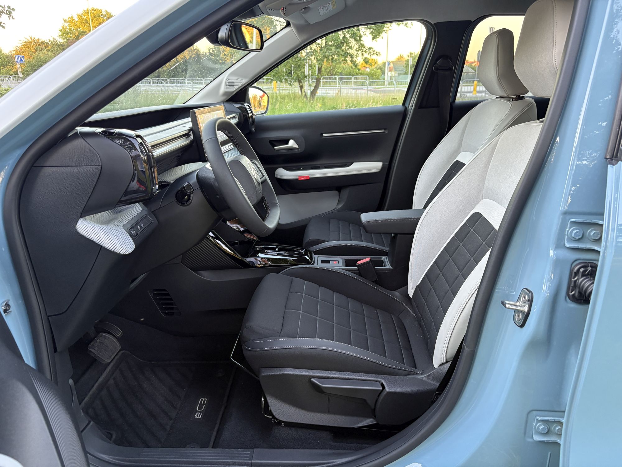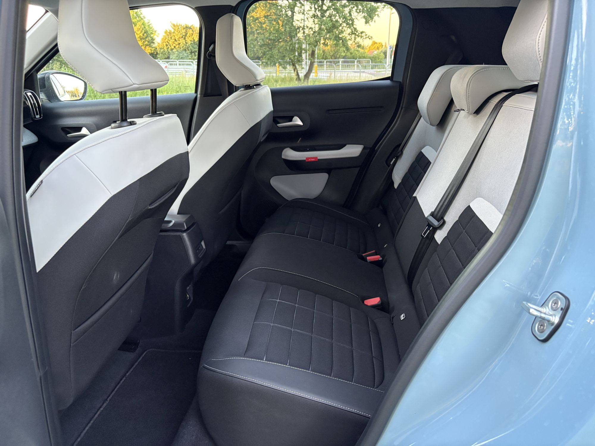 Jednak prawdziwym atutem testowanego przeze mnie auta są fotele Advanced Comfort, standardowe w wersjach Plus i Max (testowana). Są szerokie, miękkie i zapewniają ponadprzeciętny komfort, co w połączeniu z zawieszeniem opartym na progresywnych ogranicznikach hydraulicznych sprawia, iż ë-C3 wręcz płynie po nierównościach. Pod względem pracy zawieszenia auto wyróżnia się na tle innych modeli z miejskiego segmentu. Zresztą, jak na segment B, imponuje również ilość miejsca na tylnej kanapie, gdzie choćby wyższe osoby nie powinny narzekać na brak przestrzeni na nogi czy nad głową. Bagażnik ma pojemność 310 litrów, co jest wartością typową dla tej klasy i na zakupy w mieście w zupełności wystarczy.