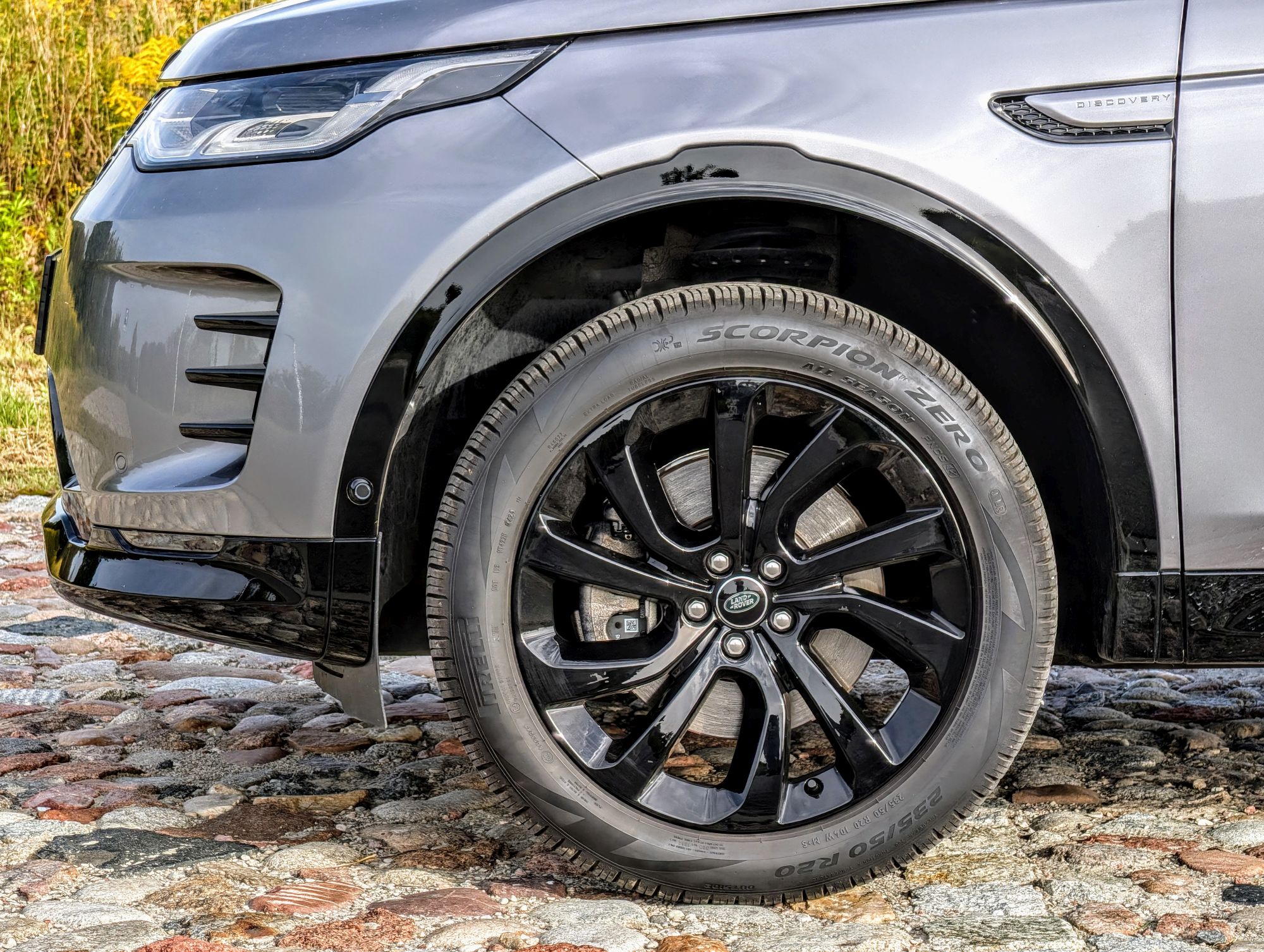 Testowany egzemplarz został postawiony na 20-calowych, czarnych felgach (wzór 5089), które świetnie wypełniają nadkola, ale – co ważne – opona wciąż ma na tyle wysoki profil (235/50 R20), iż nie boimy się każdego krawężnika. To wciąż Land Rover, a nie wyścigówka.