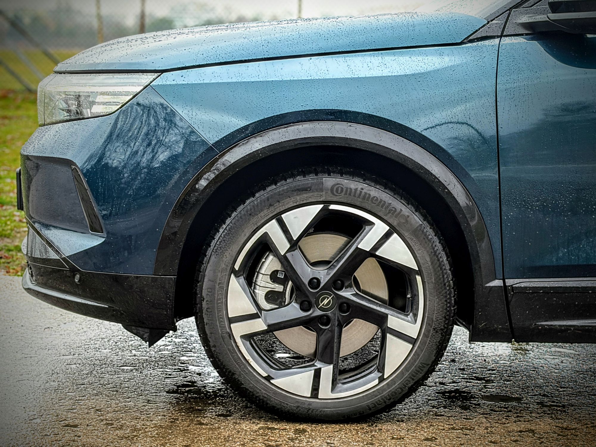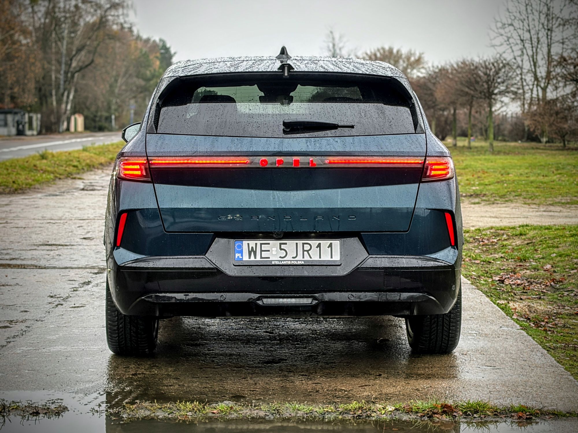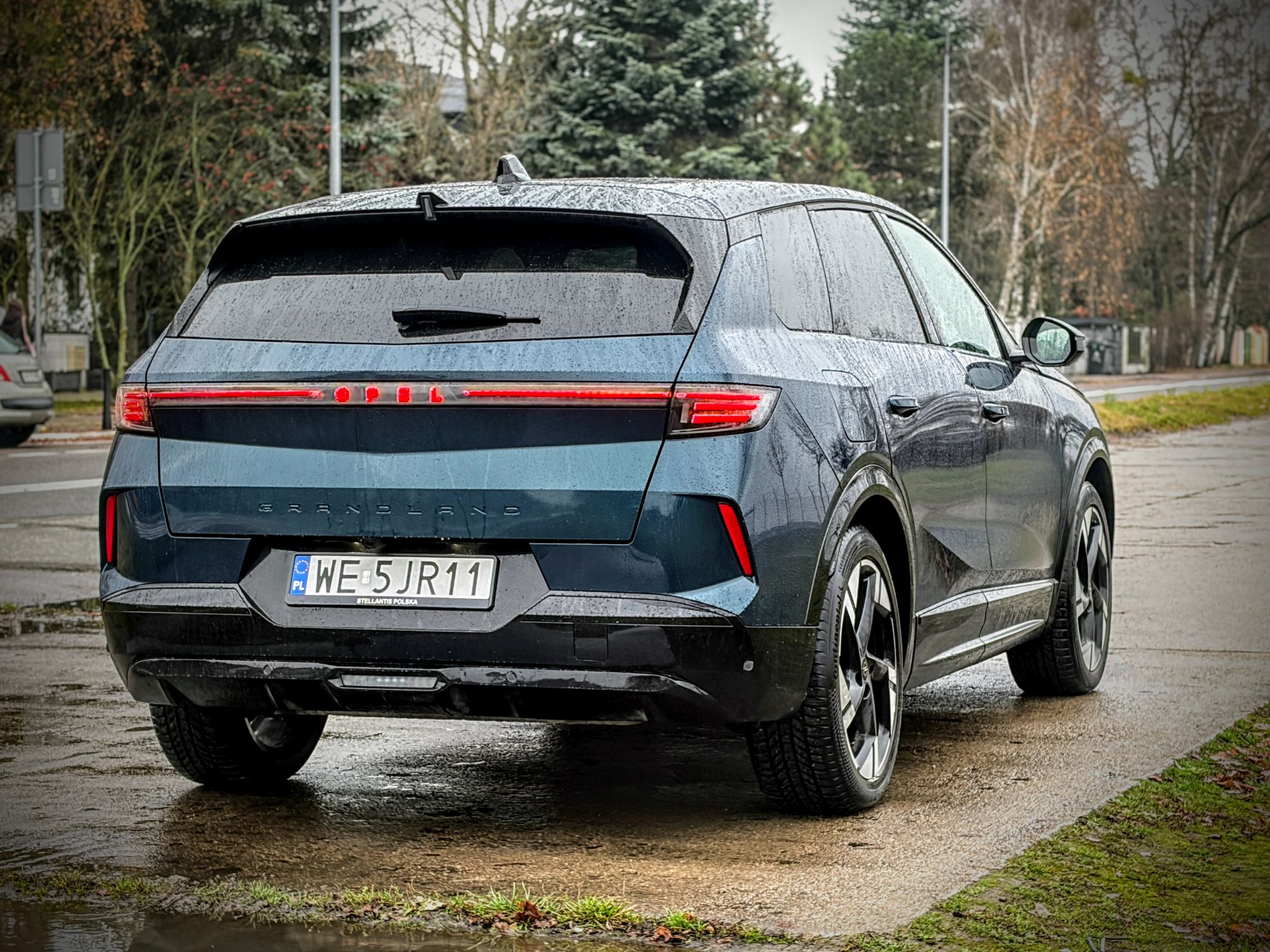 Opel przestał się wstydzić własnego logo w pasie przednim. Mamy tu podświetlane logo na grillu oraz elegancki, szeroki, wytłaczany napis GRANDLAND rozciągnięty na tylnej klapie. W połączeniu z proporcjonalną sylwetką i nowym wzorem felg, auto wygląda solidnie i nowocześnie, celując w gusta klientów ceniących klasyczną elegancję.