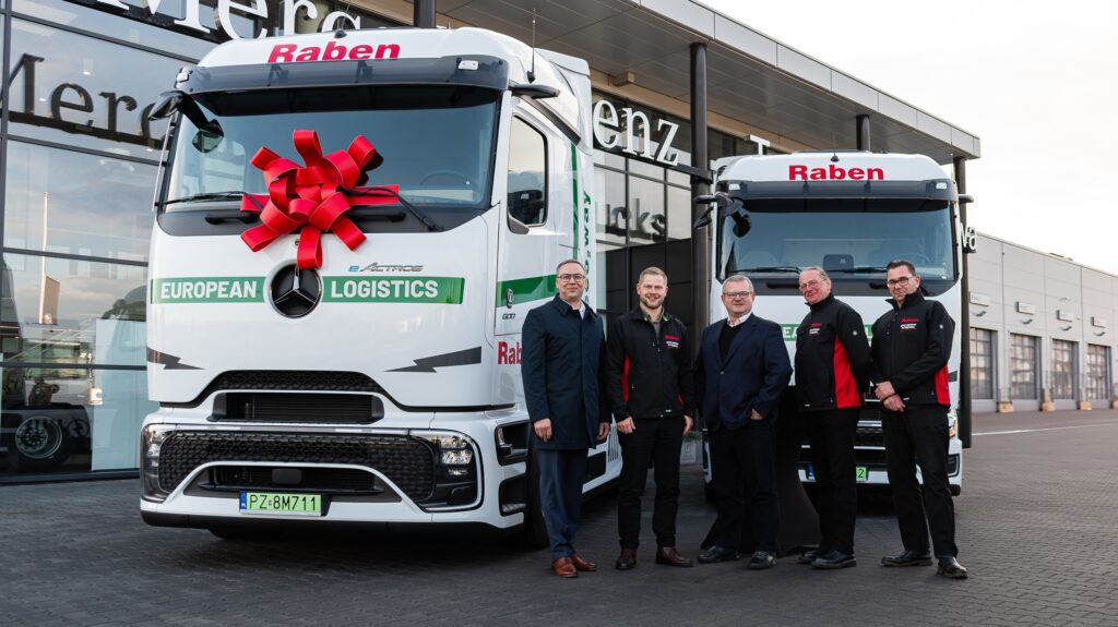 Przekazanie dwóch pierwszych eActrosów 600 dla firmy Raben Transport odbyło się uroczyście 8 grudnia w Emilianowie – warszawskim oddziale Daimler Truck Retail Polska, dealera obsługującego jednego z największych operatorów logistycznych już od 15 lat. Dwa dalekobieżne ciągniki z napędem akumulatorowym nie są pierwszymi pojazdami elektrycznymi Mercedes-Benz Trucks, które użytkuje Raben Transport.
