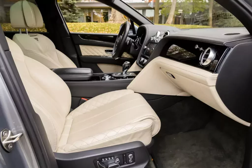 W kabinie Bentaygi znajdziemy skórzane wykończenie, podgrzewane i wentylowane przednie i tylne fotele. Te są obite lnianą skórą, która rozciąga się na deskę rozdzielczą, konsolę środkową i panele drzwi. Wyposażenie wnętrza obejmuje także system monitorowania martwego pola, adaptacyjny tempomat, czy system nagłośnienia Bentley Signature Audio. Prędkościomierz (analogowy) wyskalowany jest do 320 km/h.