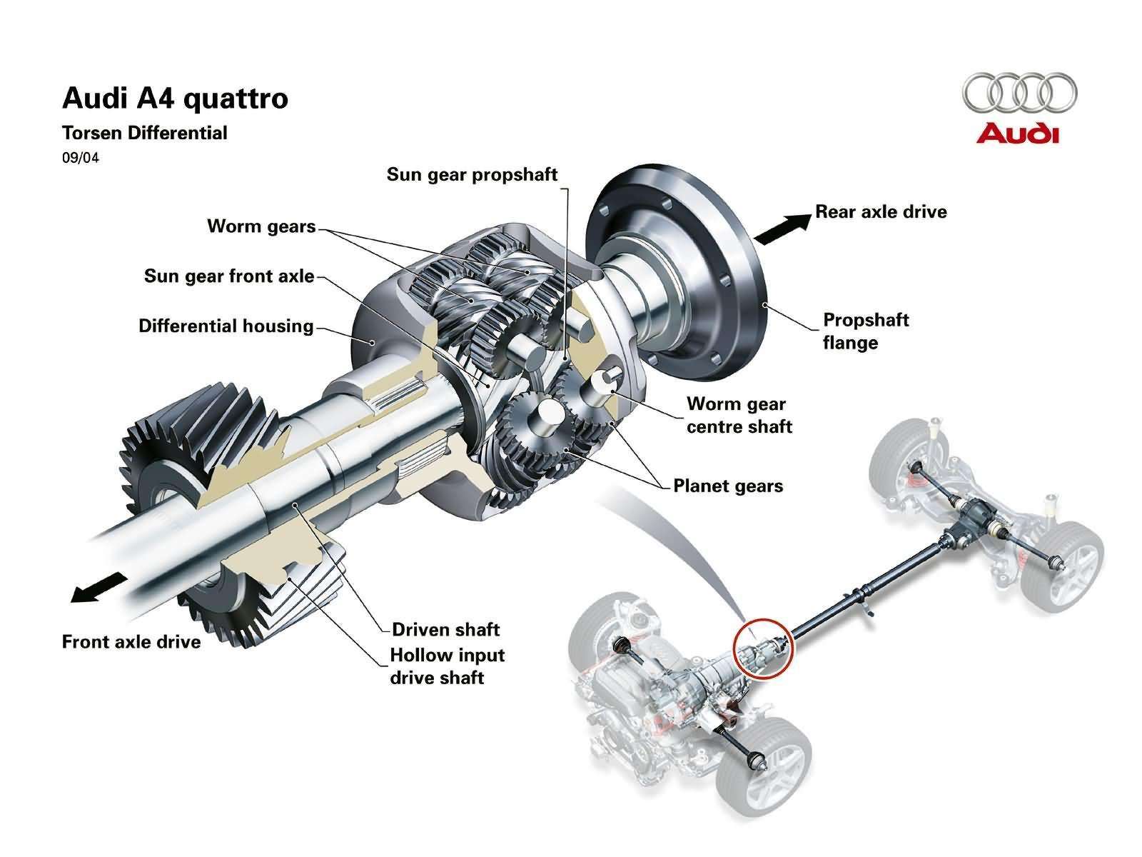 Pierwszy napęd quattro był dość prymitywną konstrukcją opartą na centralnym mechanizmie różnicowym blokowanym manualnie. Jednak już w roku 1986 wprowadzono rozwiązanie bardziej cywilne, przyjazne kierowcy. Centralny mechanizm różnicowy opracowany przez firmę Torsen miał funkcję samoblokowania poprzez odpowiedni kształt zębatek. Przekładnia ze ślimacznicami częściowo blokuje się, kiedy wystąpi różnica pomiędzy prędkością obrotową osi przedniej i tylnej, co skutkuje zwiększeniem wartości momentu obrotowego na osi o lepszej przyczepności.
