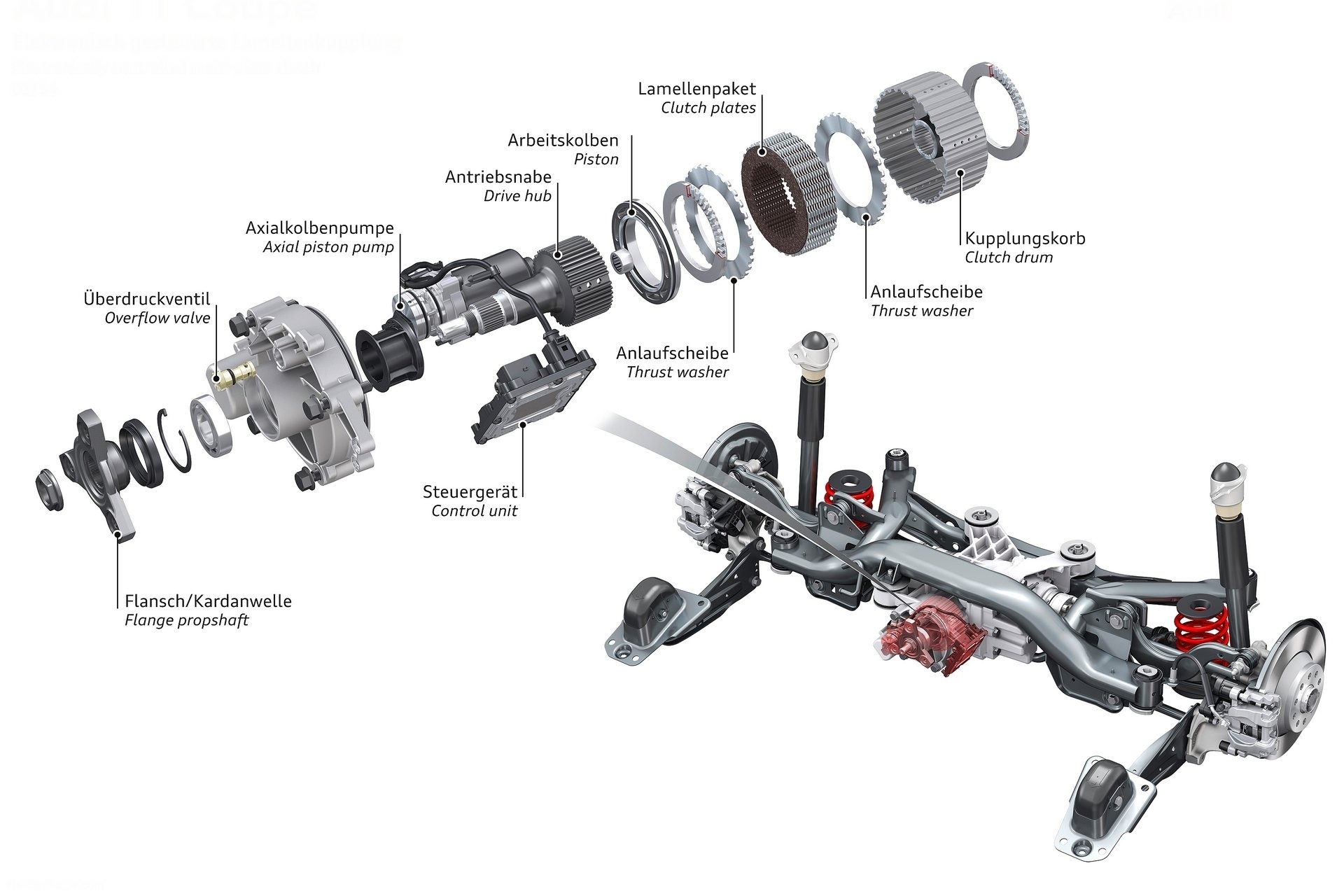 Dwa główne typy napędu quattro (z dyferencjałem i sprzęgłem) mają swoje alternatywne, nowsze wersje oparte na nieco innych mechanizmach. Pierwsza z nich jest odpowiednikiem quattro z dyferencjałem Torsena, ale opartym na mechanizmie z kołem koronowym, zbliżonym zasadą działania do tradycyjnego dyferencjału, ale sterowanym sprzęgłem wielotarczowym. Zadaniem sprzęgła jest wywieranie nacisku na mechanizm, co skutkuje jego częściowym zablokowaniem. Zwykły rozdział siły napędowej w proporcji 40:60 może się zmieniać płynnie od 15:85 do 70:30. Cały mechanizm wraz ze sprzęgłem jest zamknięty w niedużej obudowie. Cechuje go lekkość i duża wytrzymałość, prostsza konstrukcja i wysoka skuteczność. Nieprzypadkowo zastosowano go w modelach z linii RS w 2010 r.