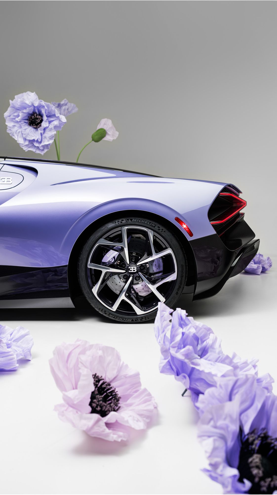 Marka z Molsheim uwielbia poetycki żargon. W materiałach opisujących ten egzemplarz czytamy o „poetyckiej wizji zakorzenionej w łagodnym pięknie kwiatów”. W praktyce oznacza to, iż ktoś postanowił wziąć jeden z najszybszych i najpotężniejszych roadsterów w historii ludzkości, po czym ubrać go w fioletowe włókno węglowe i wyhaftować mu kwiatki na boczkach drzwi. Efekt? O dziwo, hipnotyzujący.