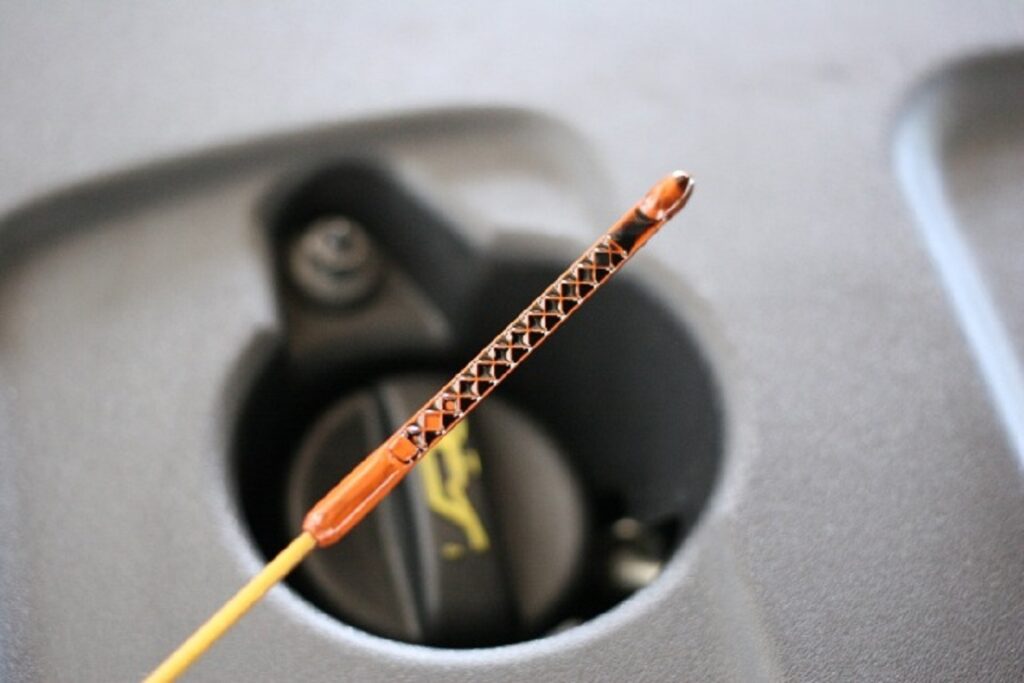 Aby rzetelnie sprawdzić stan oleju w zbiorniku, najpierw należy rozgrzać silnik, żeby trochę popracował i zaparkować auto na równym podłożu. Po wyłączeniu silnika powinniśmy odczekać około 5–10 minut i dopiero potem wyjąć bagnet pomiarowy.