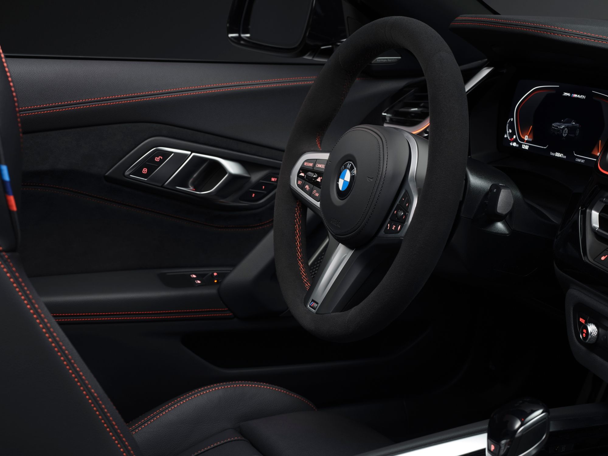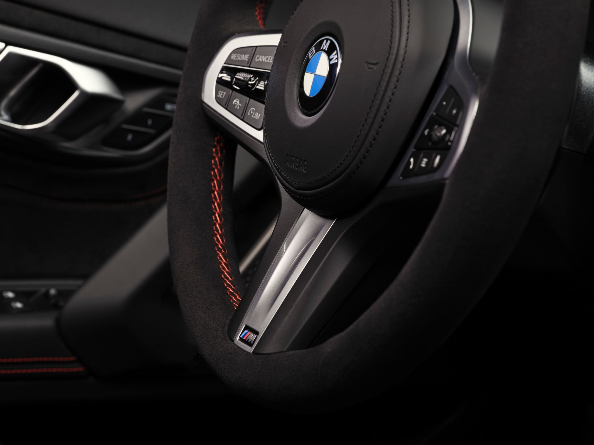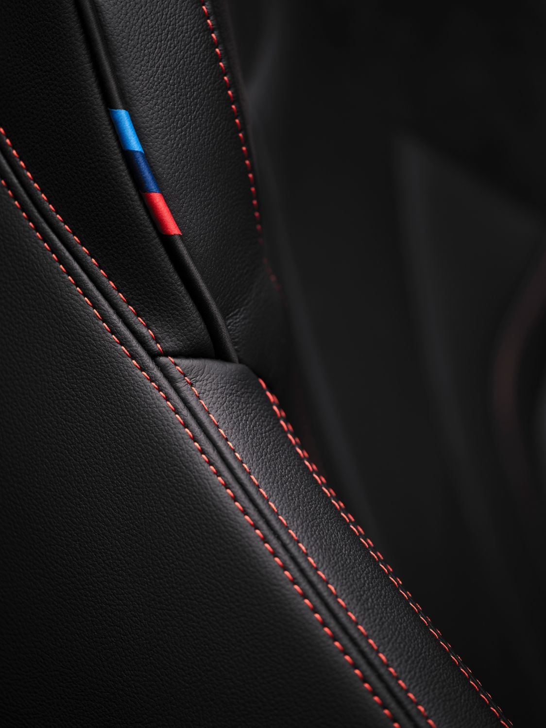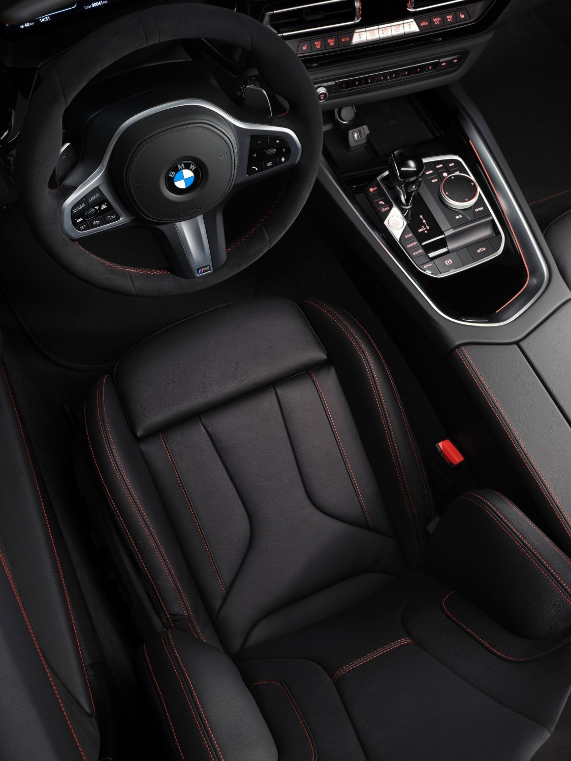 Wnętrze kontynuuje ten motyw. Znajdziemy tu sportowe fotele M wykończone skórą Vernasca i alcantarą, z kontrastującymi, czerwonymi szwami. Ten sam kolorystyczny akcent pojawia się na desce rozdzielczej, boczkach drzwi oraz kierownicy M. Całość dopełniają specjalnie grawerowane listwy progowe, podkreślające limitowany charakter pojazdu.