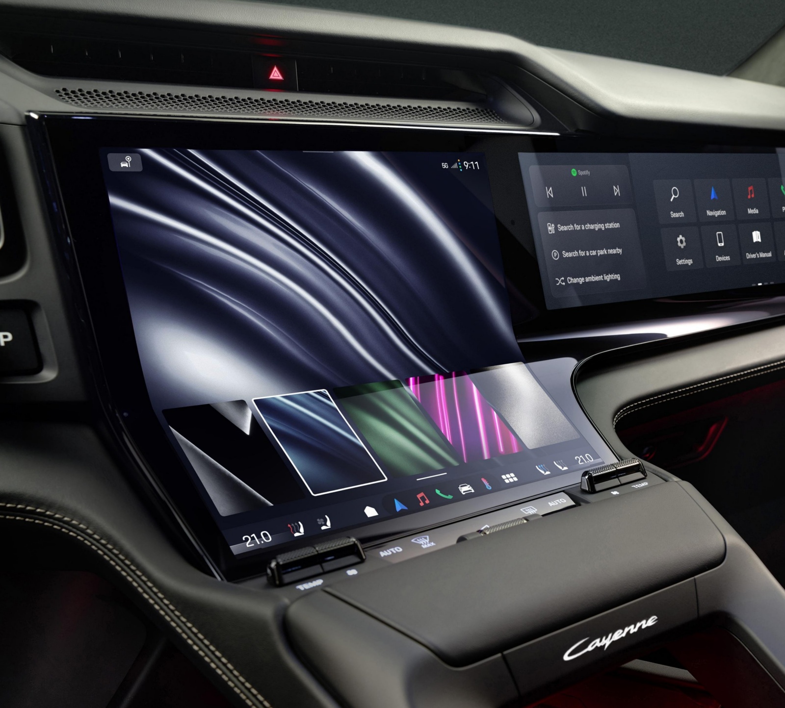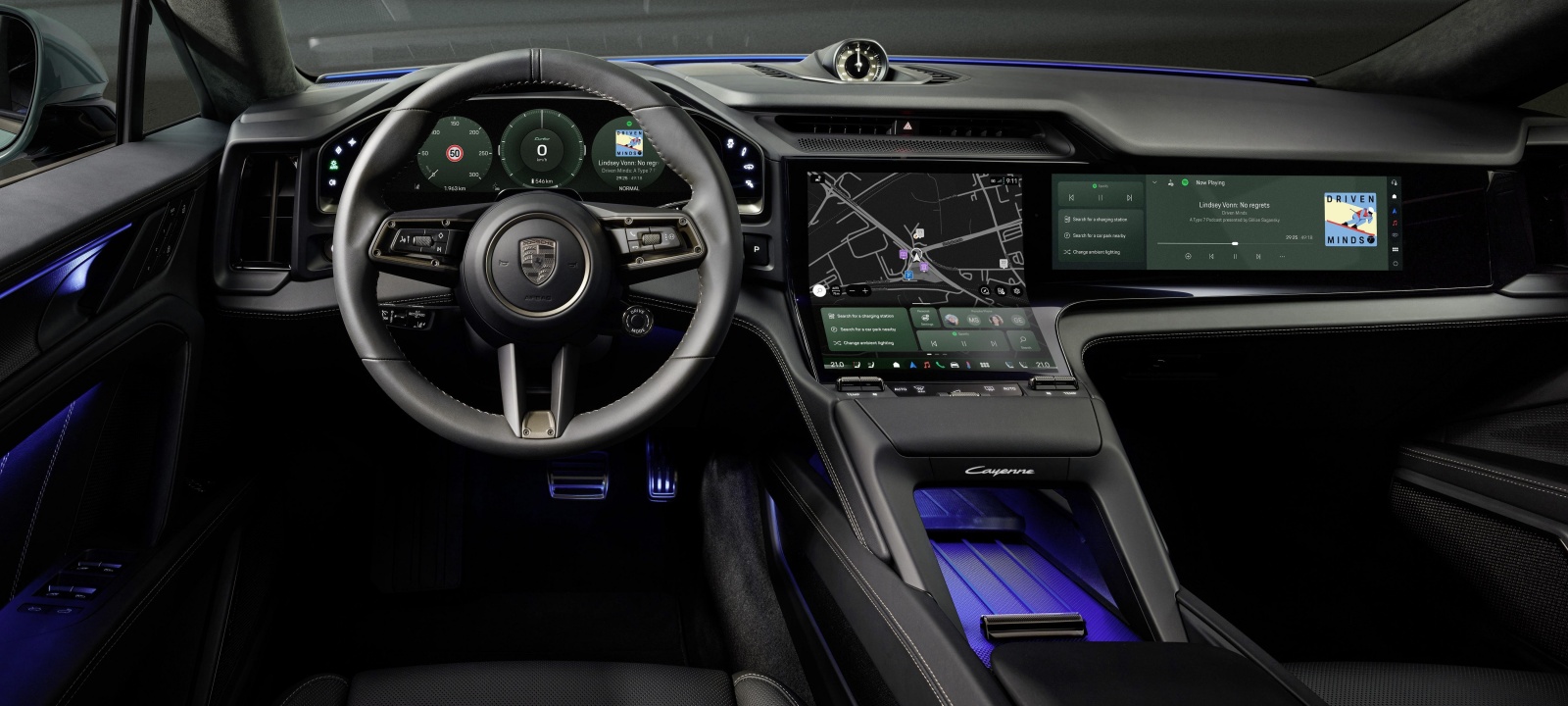 By ułatwić obsługę zastosowano konfigurowalne widżety, a dzięki aplikacji Motywy można spersonalizować kolorystykę wszystkich cyfrowych powierzchni we wnętrzu. Do wyboru jest pięć schematów kolorystycznych, które zmieniają wygląd centralnego ekranu, zestawu wskaźników oraz innych wyświetlaczy. Cayenne zaoferuje także cyfrowego asystenta głosowego korzystającego ze wsparcia sztucznej inteligencji (można za jego pomocą sterować np. klimatyzacją, podgrzewaniem siedzeń czy oświetleniem).