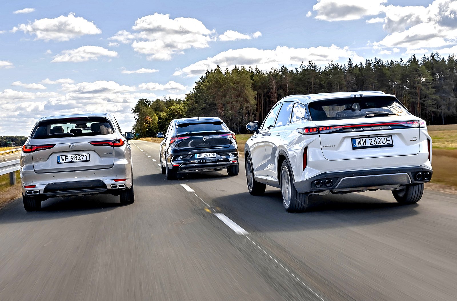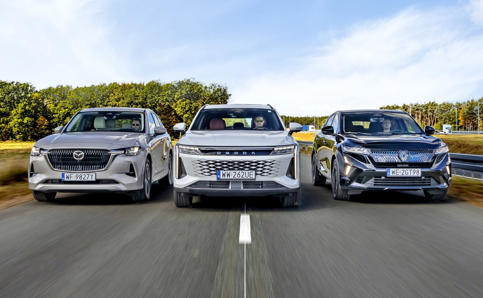 Uwaga na temat kosztów: w porównaniu wzięły udział topowe wersje Mazdy i Renault oraz jedyna oferowana Omody. Najtańsza w tym zestawieniu „dziewiątka” ma bardzo bogatą specyfikację (m.in. wentylowana kanapa, adaptacyjne amortyzatory). Renault jest kilka droższe, a już w tańszej wersji esprit Alpine za 226 900 zł oferuje sensowne wyposażenie. Za maksymalnie wyposażoną Mazdę trzeba zapłacić o ponad 100 tys. zł więcej. Po możliwym zrównaniu specyfikacji cena Omody (219 900 zł) pozostaje bez zmian, CX-60 rośnie do 336 100 zł, a Rafale – do 258 900 zł.