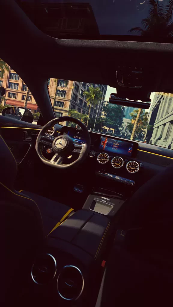 Wnętrze także jest dość szczególne. Klienci otrzymają wyjątkowe fotele AMG Performance z czarną tapicerką MB-Tex z mikrofibrą. Fotele mają żółte, kontrastowe przeszycia, a także haft „45 S” na zagłówkach.