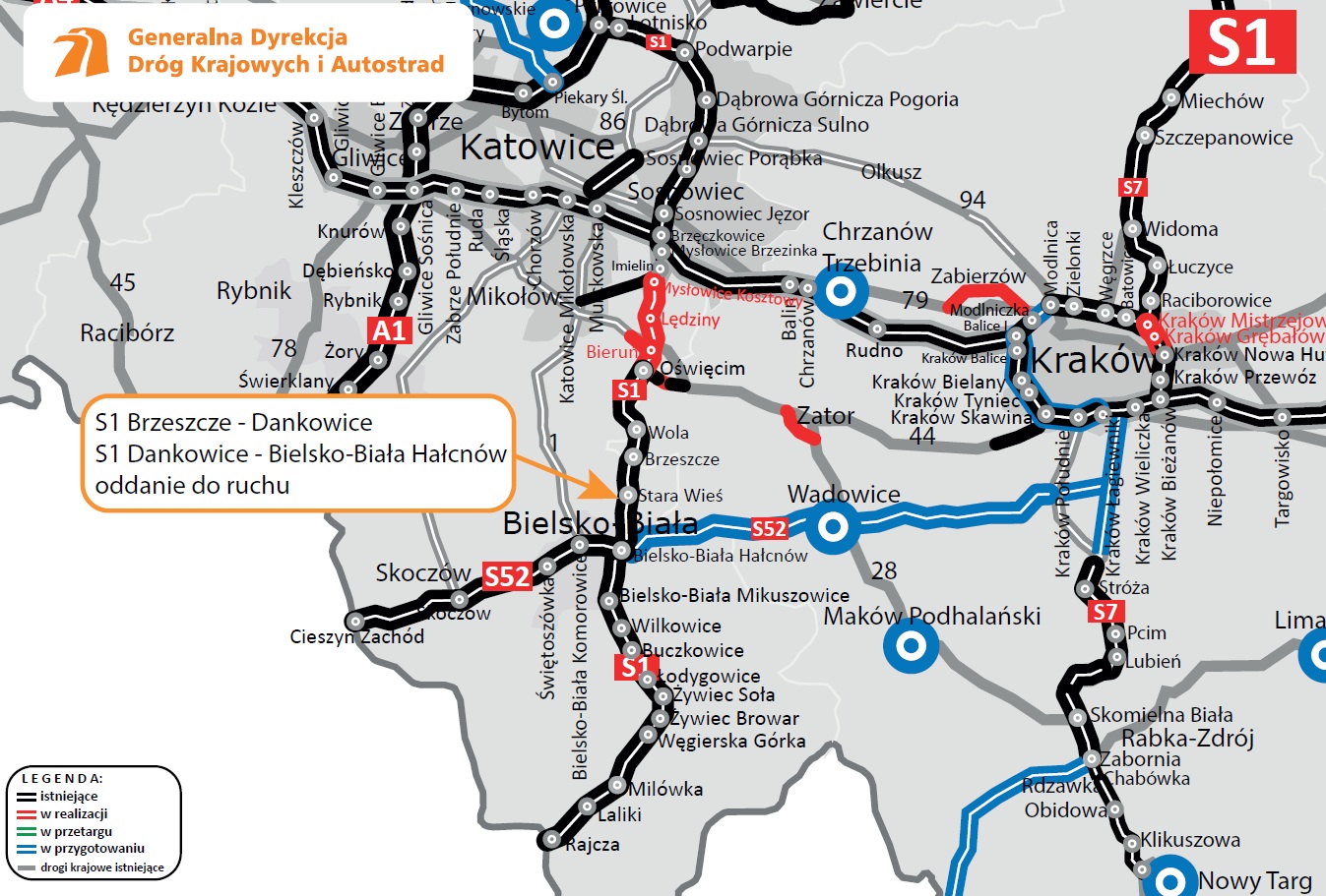 Na tej drodze GDDKiA udostępniła do ruchu ponad 17-kilometrowy odcinek od węzła Brzeszcze przez Dankowice do węzła Bielsko-Biała Hałcnów (w efekcie z okolic Oświęcimia da się dojechać S1 do granicy). Powstały tutaj Miejsca Obsługi Podróżnych – MOP Dankowice Wschód i MOP Dankowice Zachód oraz węzeł Stara Wieś. W ramach tej inwestycji przebudowano też węzeł Bielsko-Biała Hałcnów, który łączy S1 z drogą ekspresową S52 w kierunku Cieszyna i granicy z Czechami, a w przyszłości połączy S1 z Beskidzką Drogą Integracyjną prowadzącą do Krakowa.