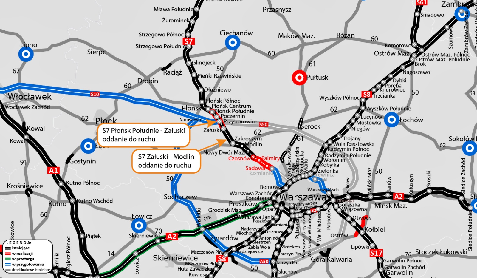 Ponieważ w październiku udostępniono odcinek Modlin-Czosnów, obecnie można już korzystać z całego 35-kilometrowego fragmentu S7 pomiędzy Płońskiem a Czosnowem.