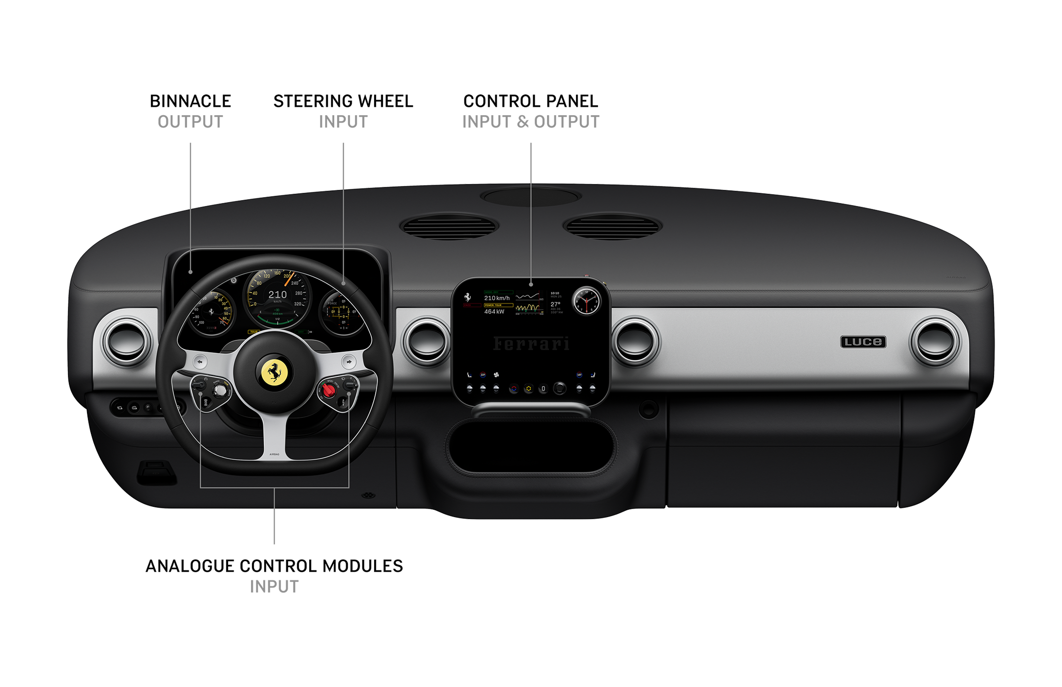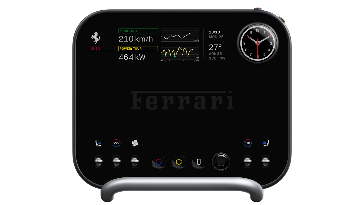 Ferrari Luce – kierownicaCentralny panel sterowania to ekran OLED o przekątnej 10,12 cala, zamontowany na przegubie kulowym, co pozwala na jego obracanie w stronę kierowcy lub pasażera. Pod ekranem znajduje się podparcie dłoni, a obsługa odbywa się dzięki pięciu aluminiowych przełączników i szklanego pokrętła głośności. W prawym górnym rogu ekranu umieszczono multigraf – mechaniczno-cyfrowy zegar z trzema niezależnymi wskazówkami, który może pełnić funkcję zegara, chronografu, kompasu lub wskaźnika Launch Control. Mechanizm multigrafu to autorskie rozwiązanie LoveFrom.