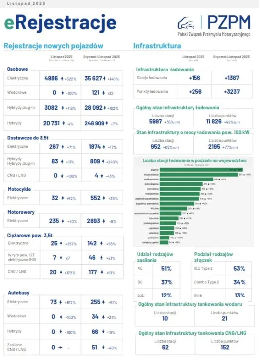 W listopadzie 2025 roku zarejestrowano 4 986 nowych samochodów elektrycznych, co oznacza ponad czterokrotny wzrost względem analogicznego miesiąca rok wcześniej. Od stycznia do listopada liczba rejestracji osiągnęła 35 627 sztuk, czyli o 140% więcej niż w 2024 roku. Po raz pierwszy udział elektryków w rynku przekroczył 10%, co jest symbolicznym przełomem – jeszcze na początku roku wynosił zaledwie 2,5%. Wyraźne wzrosty odnotowano również w innych kategoriach pojazdów. Elektryczne samochody dostawcze, których zarejestrowano 267 sztuk, cieszą się rosnącym zainteresowaniem firm kurierskich, sieci handlowych i przedsiębiorstw logistycznych.