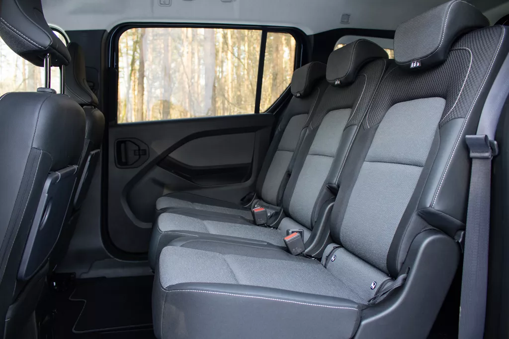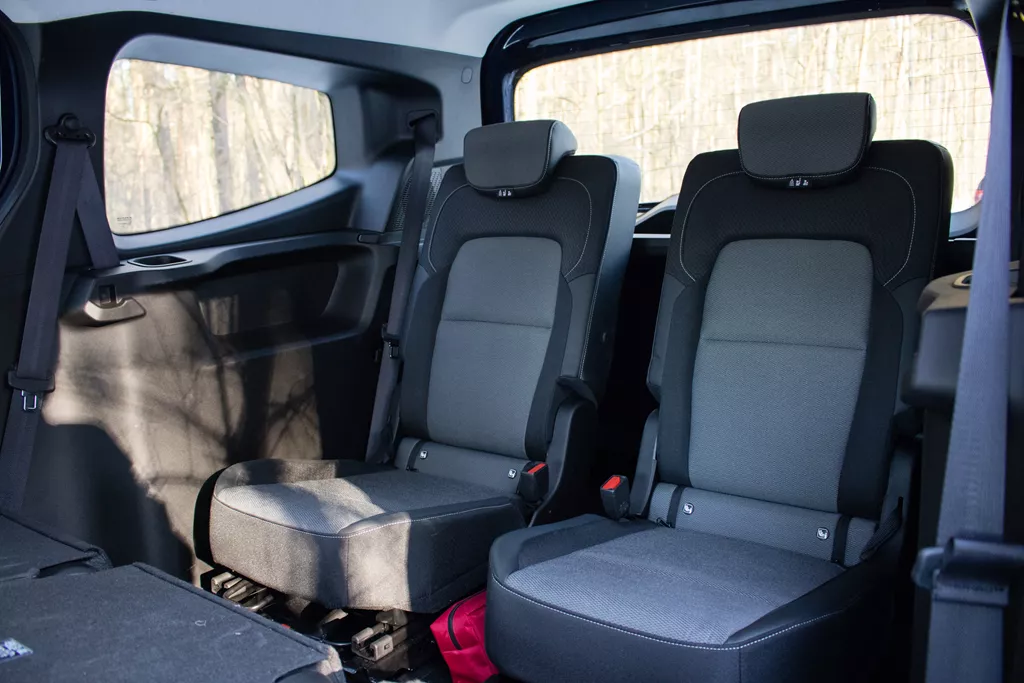 Dostęp do drugiego rzędu jest równie wygodny, dzięki odsuwanym drzwiom. Znajdują się tam trzy oddzielne fotele, które można dowolnie przesuwać i składać – choć regulacja do tyłu jest ograniczona. Na zdjęciach fotele ustawiono maksymalnie odsunięte do tyłu – przez cały czas miejsca po bokach i nad głowami jest pod dostatkiem, a przestrzeń na nogi w zupełności wystarcza.