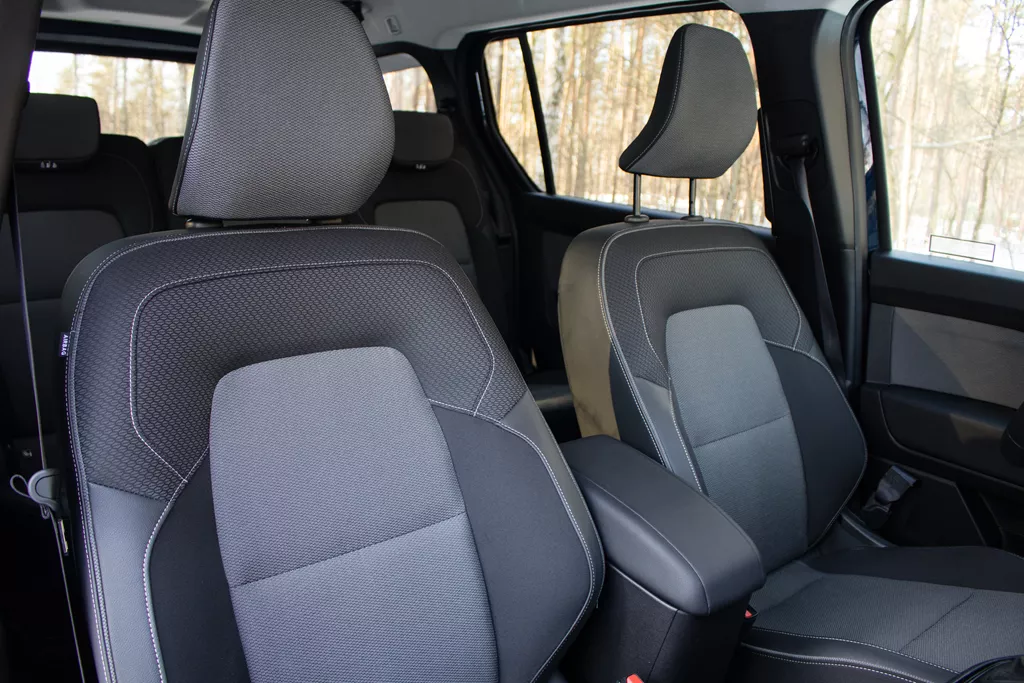 Najwygodniej jest z przodu, gdzie czekają dwa obszerne fotele z wyraźnie zaznaczonymi boczkami i szerokim zakresem regulacji manualnej, w tym odcinka lędźwiowego. W naszym egzemplarzu fotele były dodatkowo podgrzewane (dopłata 850 zł), choć podgrzewanej kierownicy nie przewidziano.
