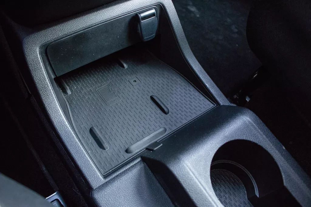 Schowków i półek w Renault Grand Kangoo jest naprawdę mnóstwo. Nad przednimi fotelami znajdziemy dużą półkę, przed pasażerem – pojemny schowek, a w podłokietniku – dodatkowy, mniejszy schowek. Kieszenie w drzwiach są obszerne, a całość uzupełniają półeczka na telefon pod panelem klimatyzacji, półka z ładowarką indukcyjną oraz dwa cupholdery między przednimi fotelami.