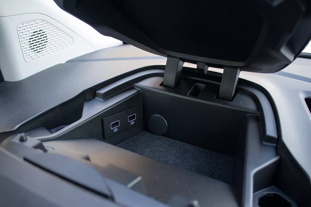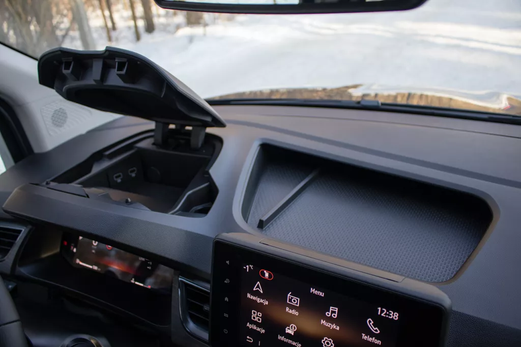 Dodatkowo na podszybiu znajduje się półka oraz zamykany schowek z portami USB i gniazdem 12V. Wszystko jest łatwo dostępne, praktyczne i zaprojektowane tak, aby podróż była wygodna zarówno dla kierowcy, jak i pasażerów.