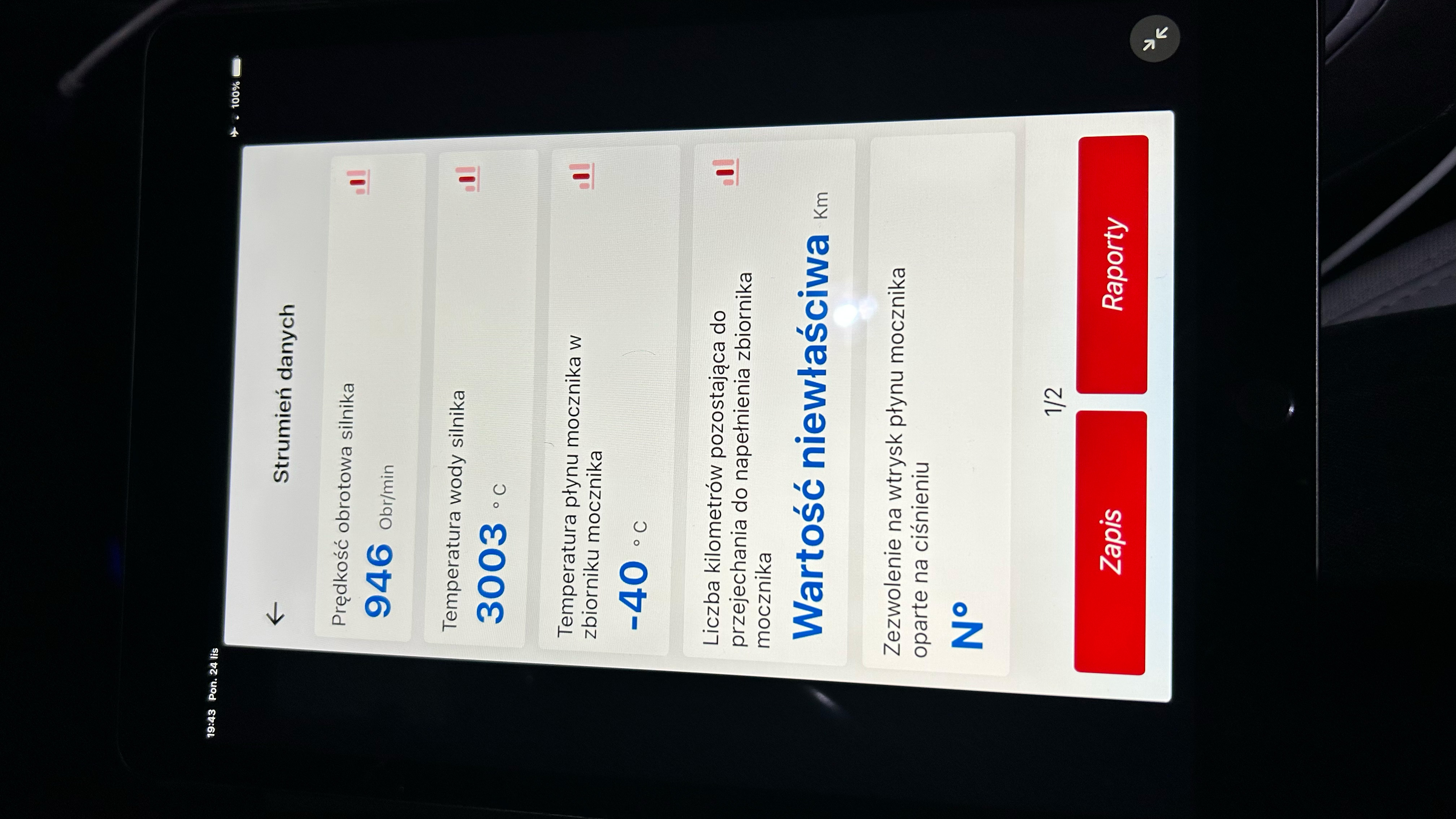 Kolejna próba to diagnostyka układu oczyszczania spalin. Efekt? Kuriozalne wartości czy wprowadzające w błąd informacje, jak „niewłaściwa ilość mocznika w zbiorniku” (za duża czy za mała?), jego temperatura -40°C albo informacja o tym, iż wypalanie filtra DPF odbywa się przeciętnie co 6000 km, kiedy w rzeczywistości wypala się co 200-280 km. Przeprowadzenie serwisowej regeneracji DPF-u było niemożliwe i nie wiadomo, z jakiego powodu. Nie dało się też sprawdzić, czy filtr w ogóle tego potrzebował. Urządzenie nie pokazuje stopnia napełnienia filtra.