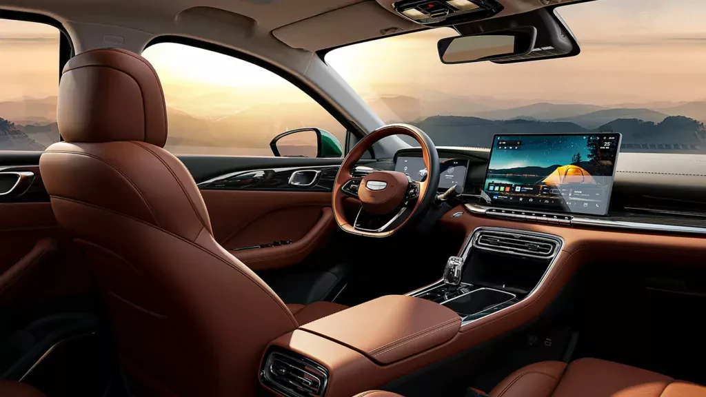 fot. GeelyWizualnie nowy model podąża śladami poprzednika, choć mamy tu inne wykończenie świateł, zderzaków, czy przedniego grilla. Samochód prezentuje się bardzo atrakcyjnie, także dzięki licznym chromowanym wstawkom. Nowocześnie prezentuje się także wnętrze. Znajdziemy tu spłaszczona kierownicę, cyfrowy panel wskaźników, czy 14,6-calowy ekran multimediów. Co ważne, Geely zachowało większość fizycznych przycisków.