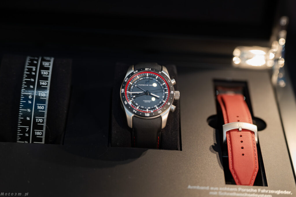 pierścieniem z podziałką tachometryczną. Kolor skórzanego paska, wykonanego z oryginalnej skóry samochodowej i przeszywanego autentyczną nicią używaną w pojazdach, można dowolnie dopasować do kolorystyki nadwozia i wnętrza auta. Na życzenie, tłoczenie z napisem „Turbo S” dodatkowo podkreśla bliskie powiązanie zegarka z jego motoryzacyjnym odpowiednikiem. Te manualnie wykonane precyzyjne instrumenty, powstają w manufakturze zegarków Porsche w Grenchen, w Szwajcarii.