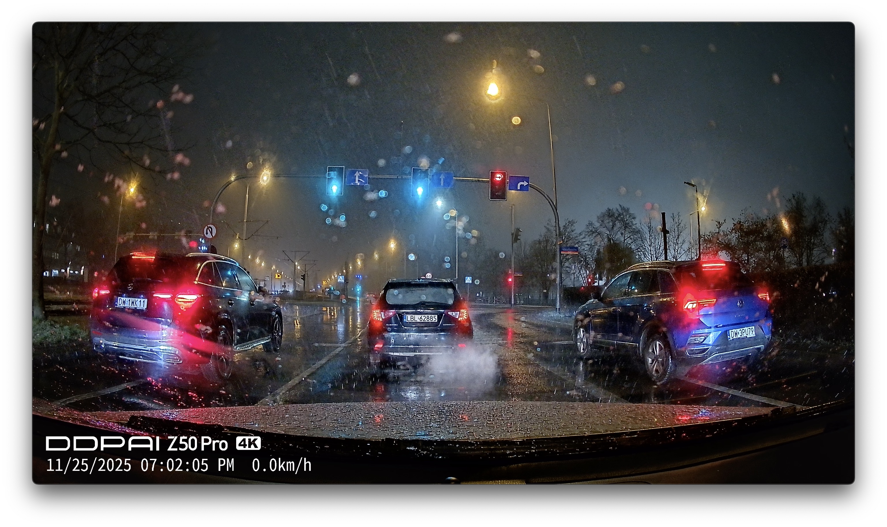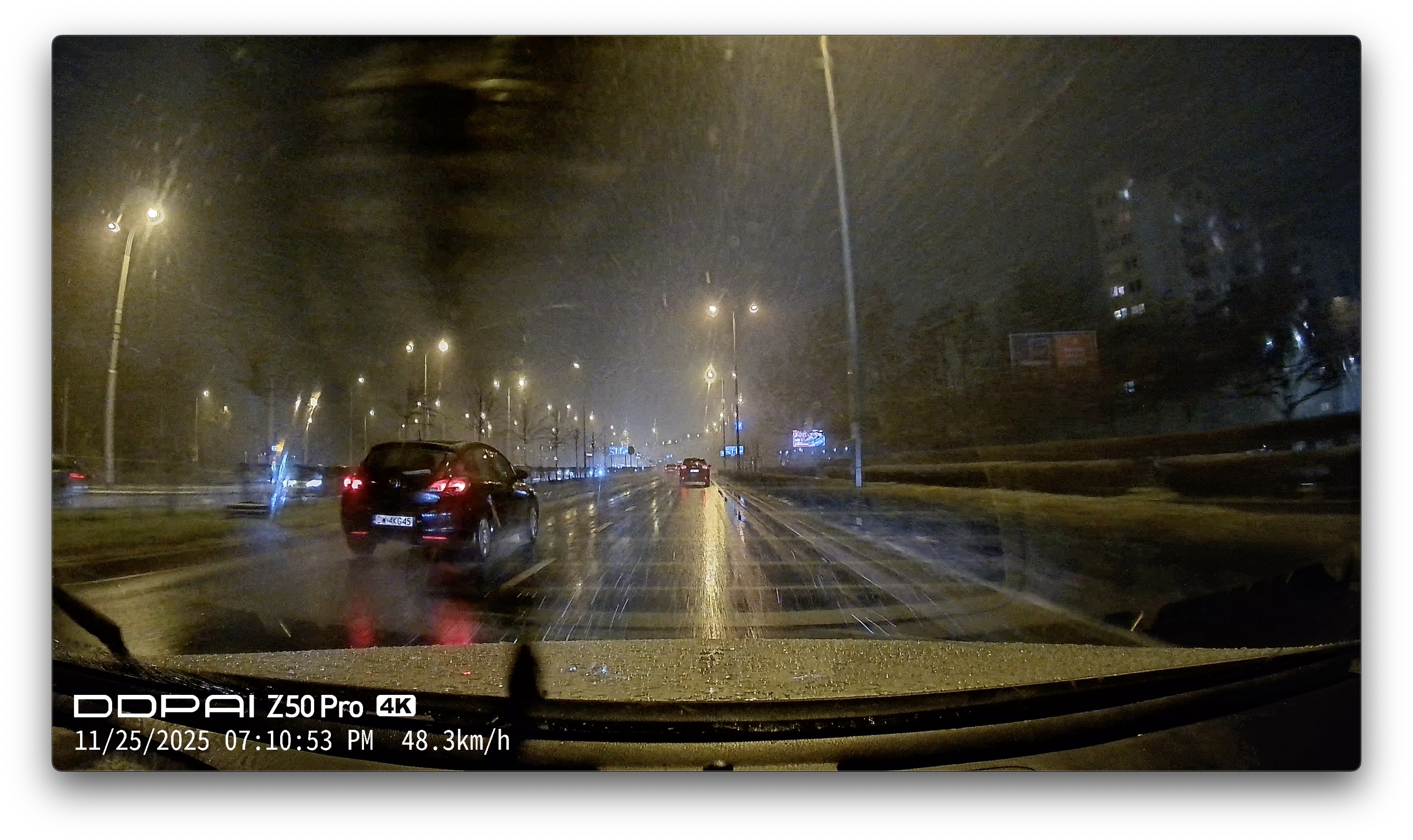 Jeśli chodzi o przednią kamerę, to choćby w deszczu i w nocy w warunkach zatrzymanych jest perfekcyjnie, niezależnie od tego, które tablice z którego pasa chcemy odczytać: