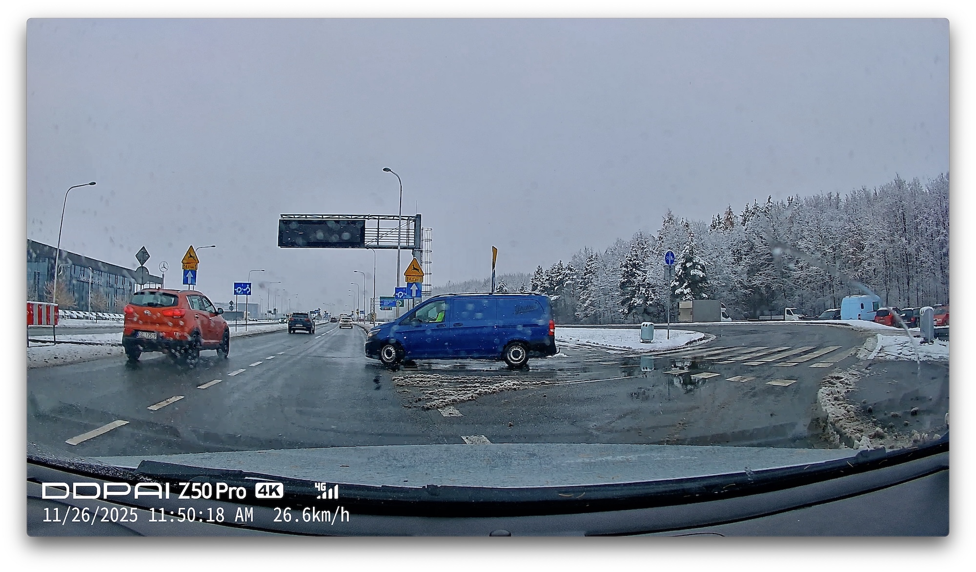 Zachlapana szyba i skręt w innym kierunku niż jedzie pomarańczowe/czerwone auto – bez uwag: