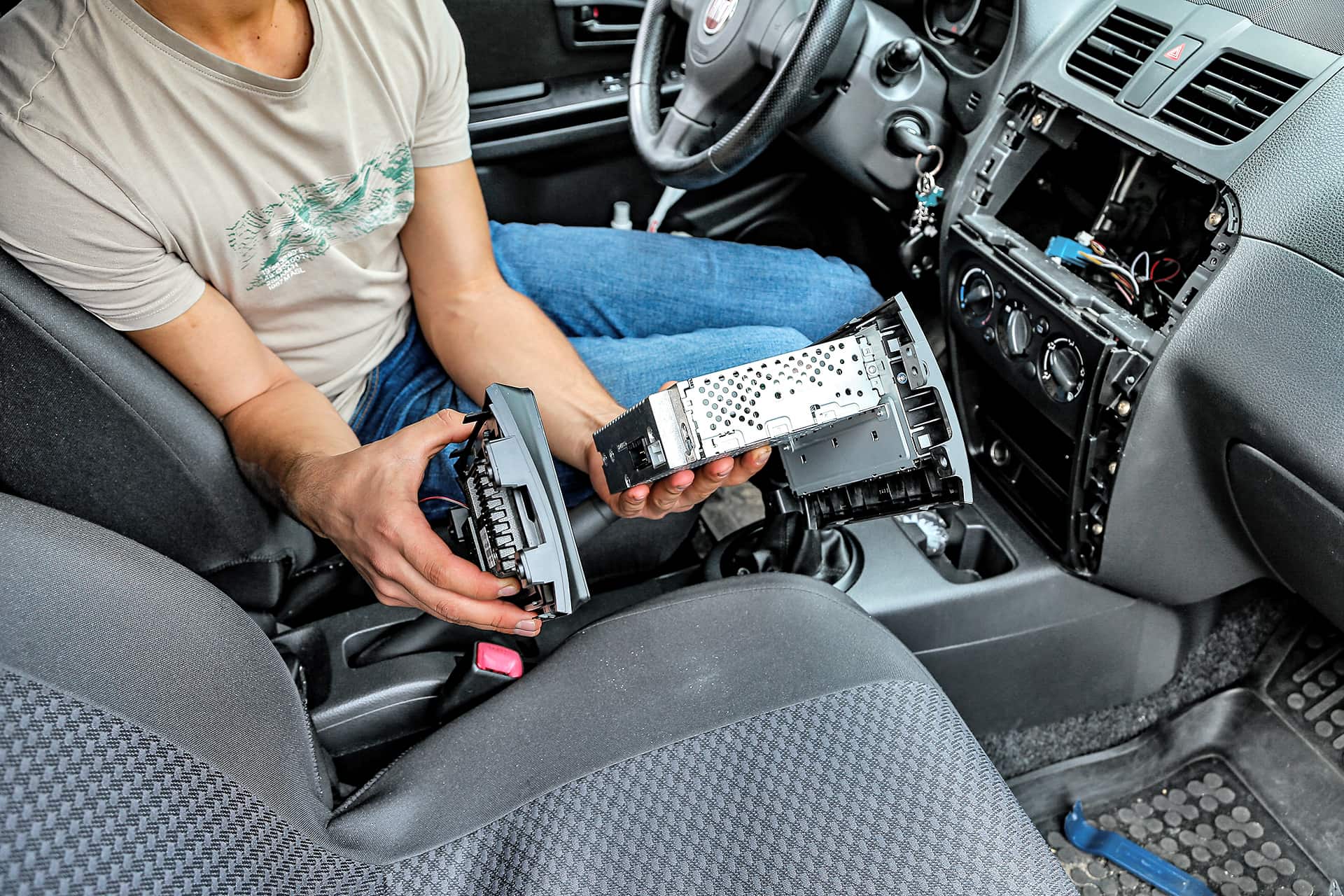 Fabryczne radio miało wielkość 2 DIN i było zintegrowane z konsolą auta. Aby je wymontować w pierwszej kolejności zdemontowaliśmy pionowe listwy ozdobne znajdujące się po bokach konsoli. W tym modelu wystarczyło je podważyć i pociągnąć. Następnie odkręciliśmy śruby mocujące znajdujące się po bokach urządzenia. Przed wyjęciem radia trzeba pamiętać o odłączeniu kabla antenowego i odpięciu kostek z przewodami.