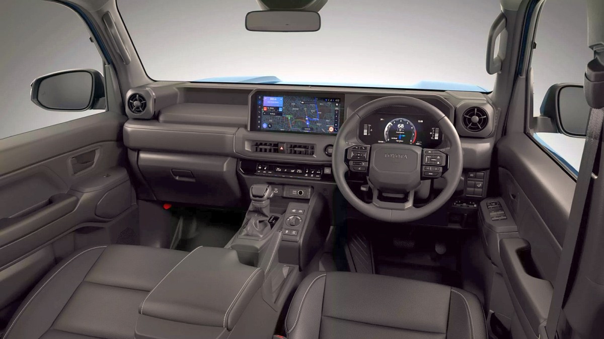 Kabina Land Cruisera FJ łączy klasyczny, użytkowy charakter z nowoczesną technologią. Znajdziemy tu masywną kierownicę, cyfrowy zestaw wskaźników oraz ekran multimedialny o przekątnej 12,5 cala.
