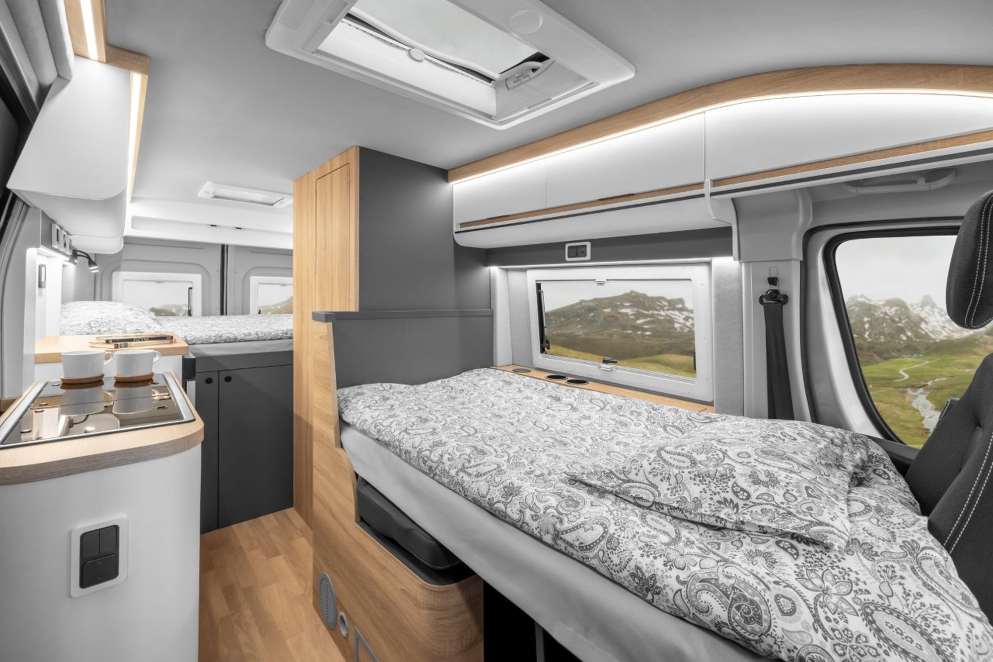 Za zasilanie urządzeń pokładowych odpowiada pojemny akumulator litowo-żelazowo-fosforanowy (LiFePO4) o pojemności 135 Ah. Dostęp do tej „kawalerki” ułatwiają przesuwne drzwi boczne z moskitierą oraz elektrycznie wysuwany stopień o szerokości 70 centymetrów.