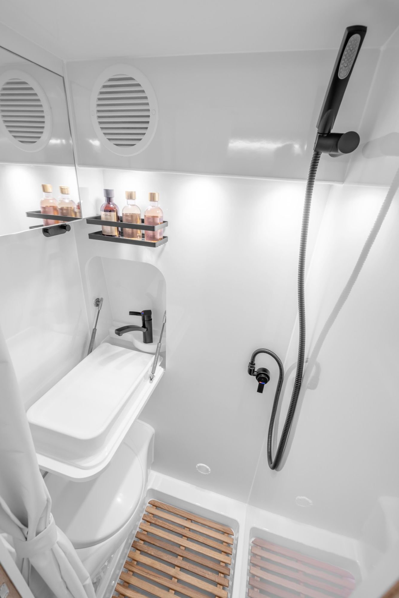 Podstawą niezależności w podróży jest odpowiednie zaplecze sanitarne i energetyczne. Fabryczne wyposażenie obejmuje kabinę prysznicową oraz zintegrowaną toaletę. W aneksie kuchennym znajdziemy 90-litrową lodówkę i dwupalnikową kuchenkę gazową. Za zapas wody odpowiada izolowany, 100-litrowy zbiornik na czystą wodę oraz 75-litrowy zbiornik na wodę szarą.