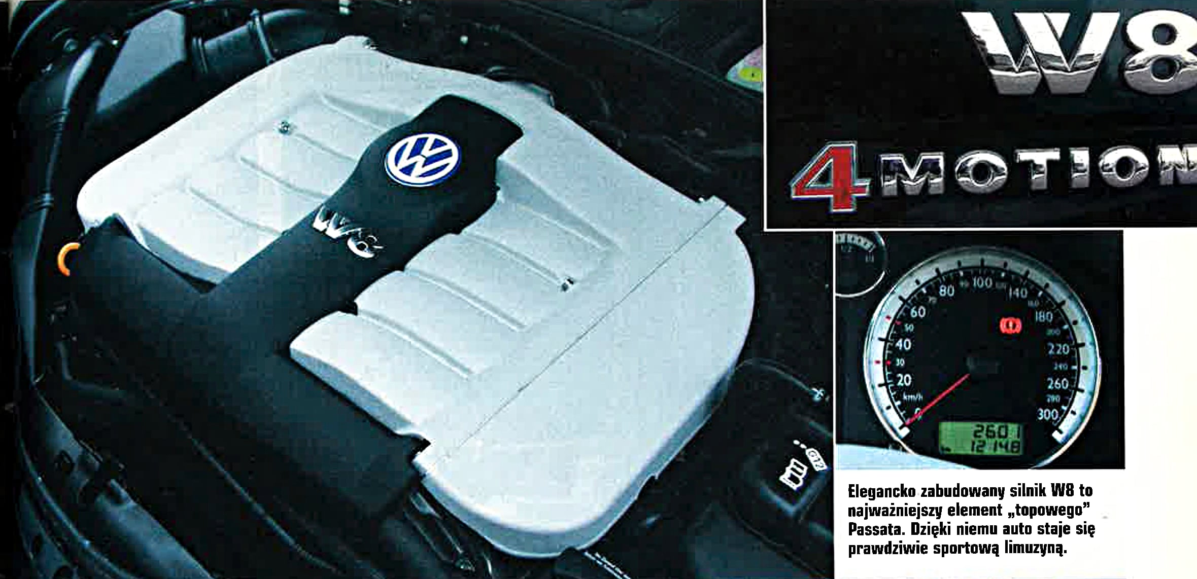 https://magazynauto.pl/wiadomosci/calkiem-nowy-passat-prezentacja-i-wrazenia-z-jazdy-volkswagenem-passatem-b5-motor-nr-42-1996,aid,3757To właśnie 4-litrowy, 8-cylindrowy silnik jest najważniejszym elementem „superpassata”. W tej w sumie niedużej limuzynie klasy średniej udało się zmieścić jednostkę, jaką spotyka się – i to również nieczęsto – w autach przynajmniej o numer większych. Dzięki 275 KM i niemałemu momentowi obrotowemu 370 Nm ważący niespełna 1700 kg Passat W8 staje się samochodem mogącym pod względem osiągów z powodzeniem rywalizować z niejednym sportowym autem, nie wyłączając z tego grona Subaru Imprezy WRX.
