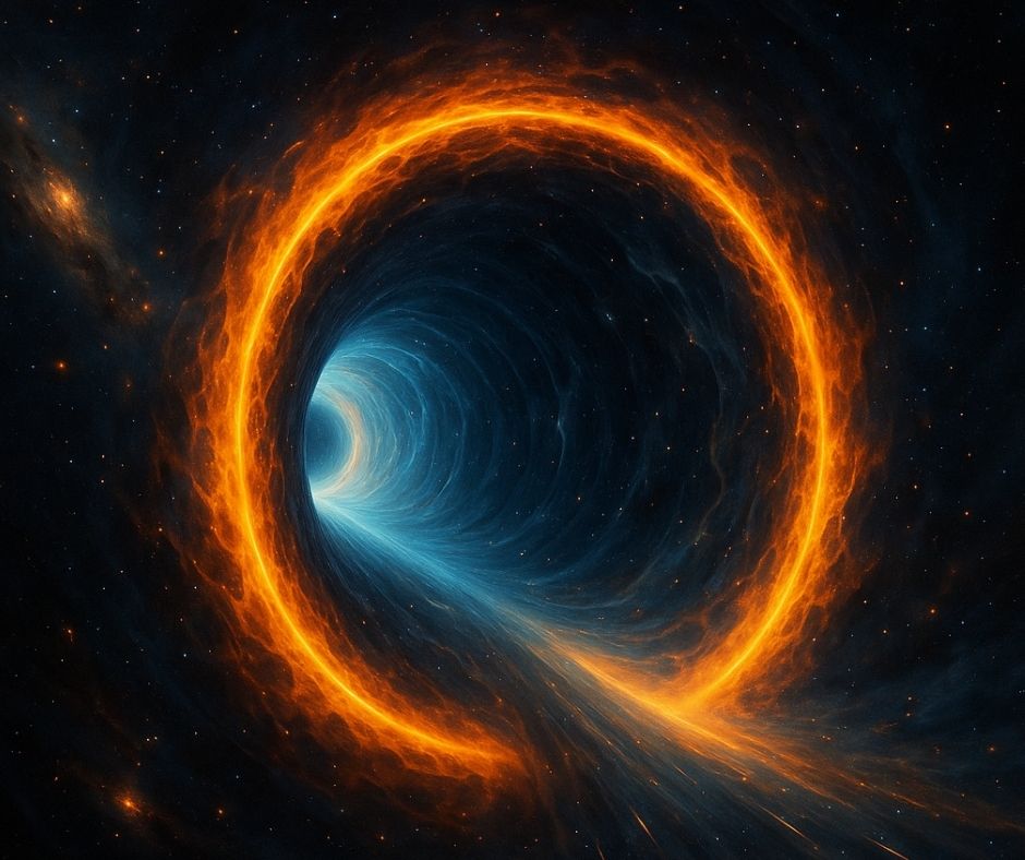 Wizualizacja takiego tunelu. Fot. AIAnaliza ugięcia światła mogłaby podpowiedzieć, jak wyglądałoby otoczenie takiego tunelu dla zewnętrznego obserwatora. Czy widzielibyśmy charakterystyczne pierścienie świetlne, podwójne obrazy odległych galaktyk, czy może zupełnie nowy wzór soczewkowania grawitacyjnego, którego nie da się pomylić z klasyczną czarną dziurą? Właśnie takie optyczne podpisy mogłyby kiedyś stać się wskazówką, iż w kosmosie istnieją egzotyczne struktury przypominające opisywane w modelu mosty między odległymi regionami czasoprzestrzeni.
