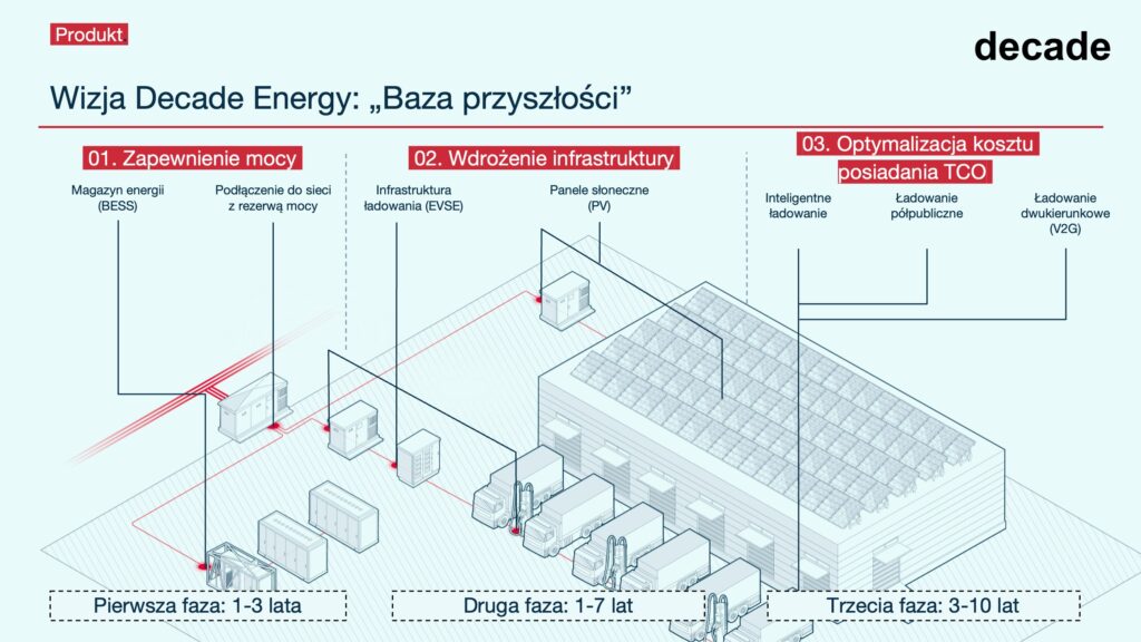 Decade Energy rozwija, finansuje i eksploatuje zintegrowaną infrastrukturę energetyczną niezbędną w bazach logistycznych do obsługi elektrycznych flot ciężarówek. Obejmuje to nowe przyłącza sieciowe, systemy magazynowania energii (BESS), stacje ładowania pojazdów, instalacje fotowoltaiczne oraz oprogramowanie do optymalizacji zużycia energii elektrycznej. Dzięki modelowi zero-CAPEX spółka pomaga właścicielom obiektów logistycznych zabezpieczyć moce przyłączeniowe, generując jednocześnie przewidywalne przychody z najmu oraz dodatkową wartość z udziału systemów BESS na rynkach energii.