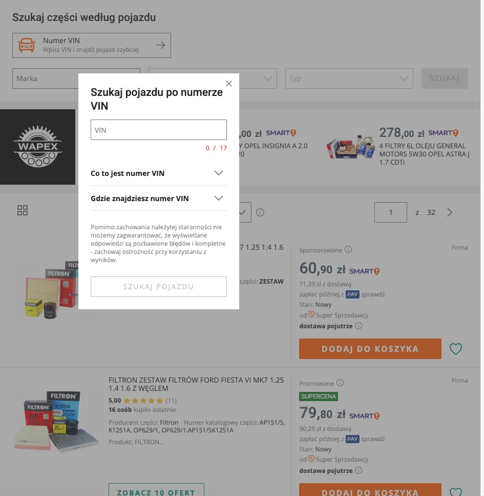 Wyszukiwanie części dzięki numeru VIN maksymalnie upraszcza ten proces. Zamiast wpisywać np. filtr kabinowy + model samochodu oraz rocznik wystarczy wpisać filtr kabinowy i wyświetli nam się przycisk „Numer VIN”.