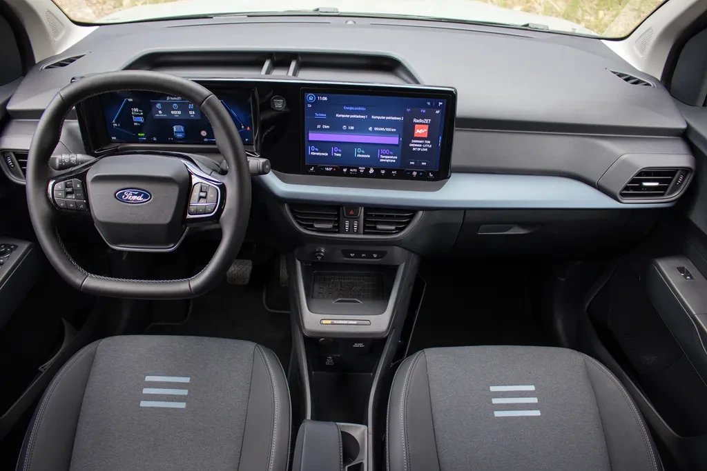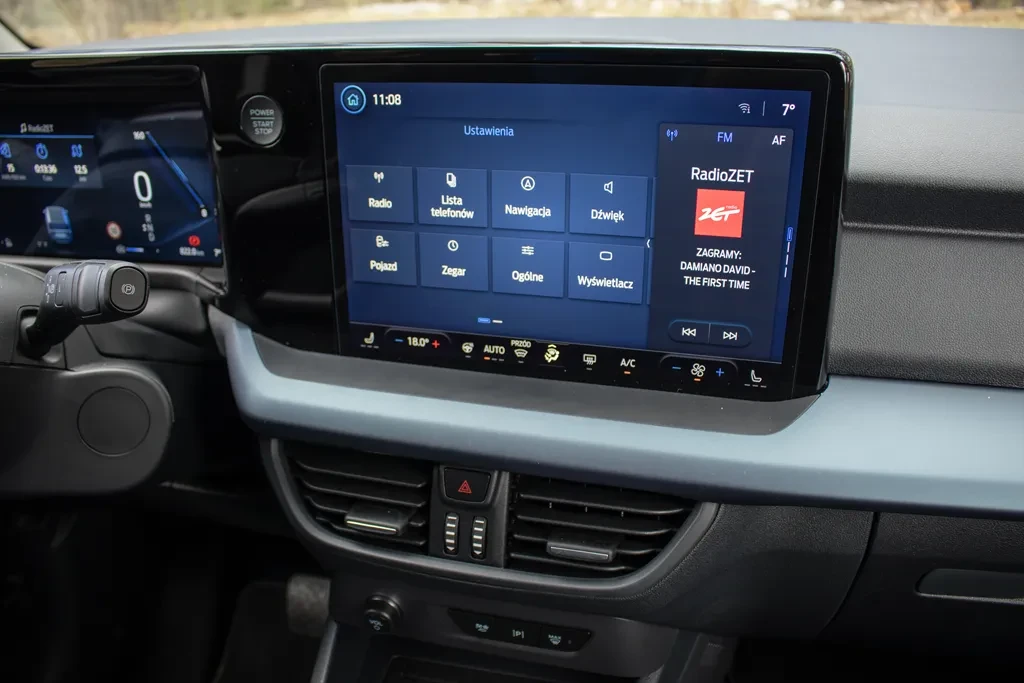 System multimedialny oparto na SYNC 4. Działa szybko, sprawnie, jest czytelny i intuicyjny. Szkoda jednak, iż podobnie jak w Fordzie Tourneo Courier zabrakło fizycznych przycisków do podstawowych funkcji — takich jak podgrzewanie tylnej szyby, nawiew na przednią szybę czy szybki dostęp do klimatyzacji. W zamian wszystko obsługujemy z poziomu ekranu, który przejął także sterowanie całym układem klimatyzacji.