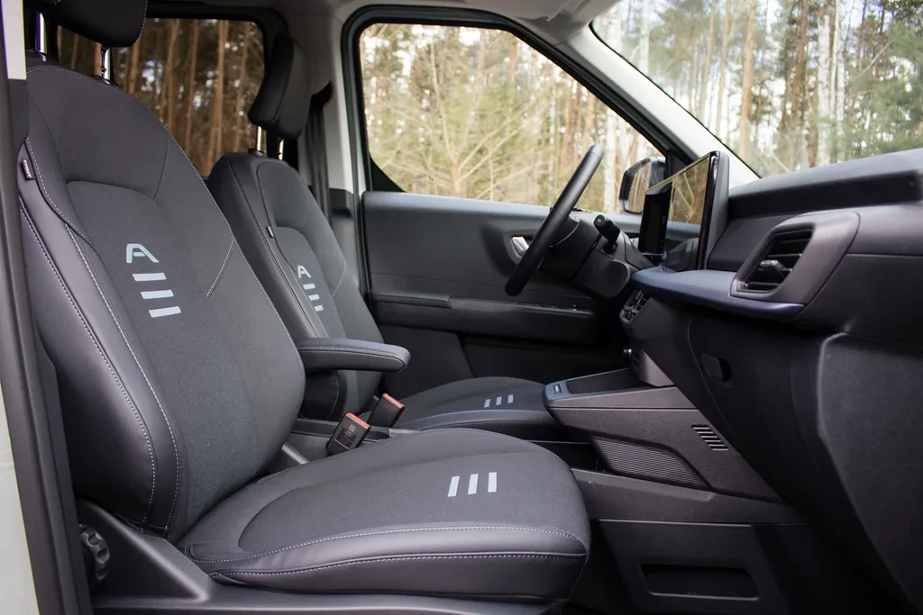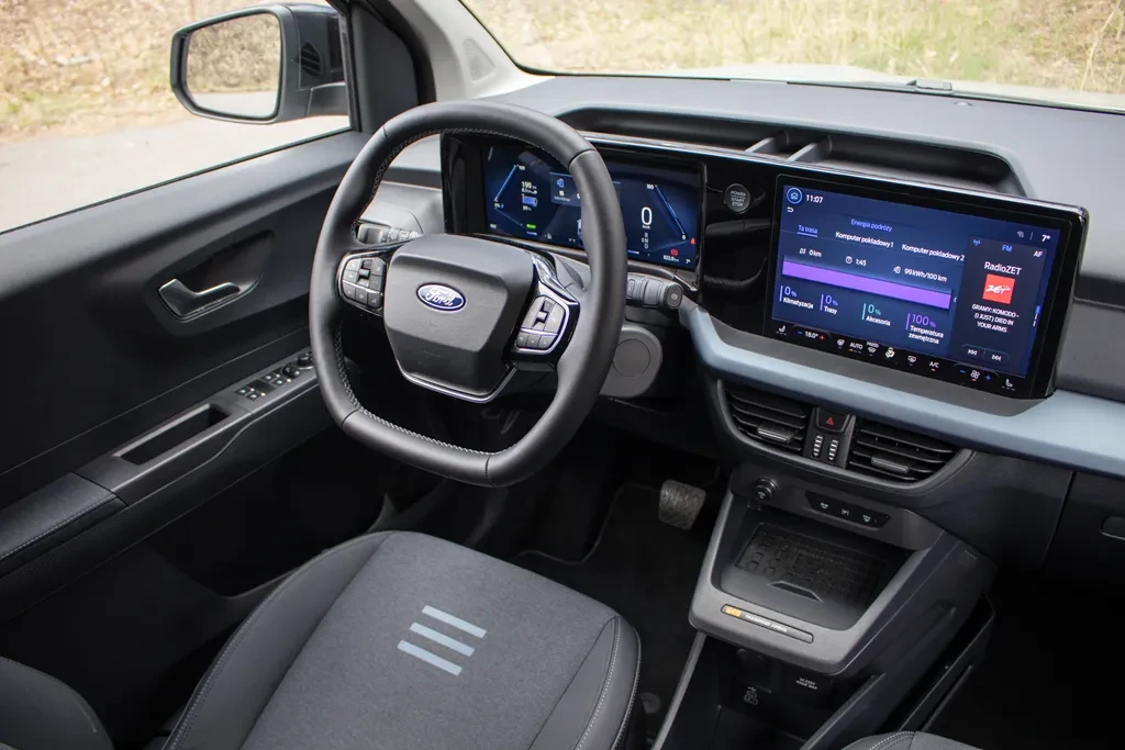 Trzeba jednak uczciwie przyznać, iż część tej różnicy „oddaje” wyposażenie. E-Tourneo Courier już w standardzie ma m.in. elektryczny hamulec postojowy, reflektory z LED-ami do jazdy dziennej, tylne lampy LED, 12-calowy ekran SYNC 4, cyfrowe zegary 12”, kamerę cofania, czujniki parkowania z przodu i z tyłu, a także podgrzewaną szybę, kierownicę i fotele. W spalinowej wersji część z tych elementów jest niedostępna lub wymaga dopłaty.