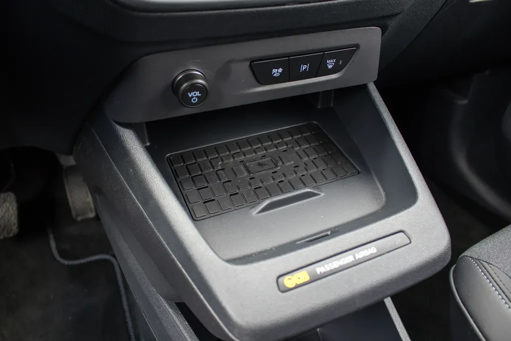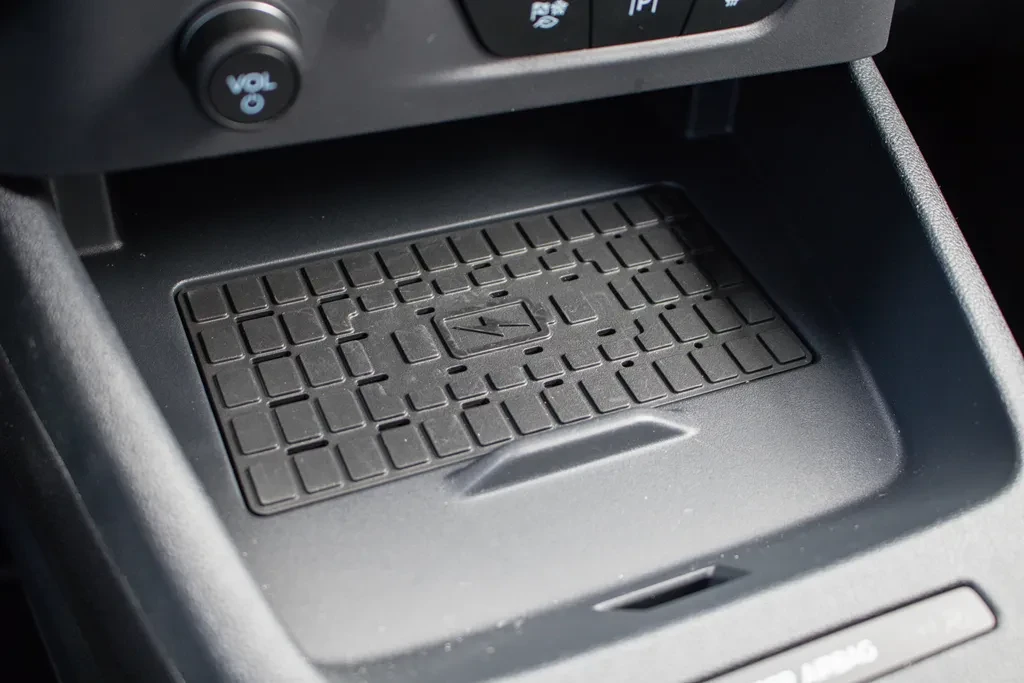 Bardzo dobrze zaprojektowano także przestrzeń między przednimi fotelami. Znajdziemy tu bezprzewodową ładowarkę w wygodnym miejscu, a niżej dodatkowe półki i przegródki, które można zagospodarować na wiele sposobów.