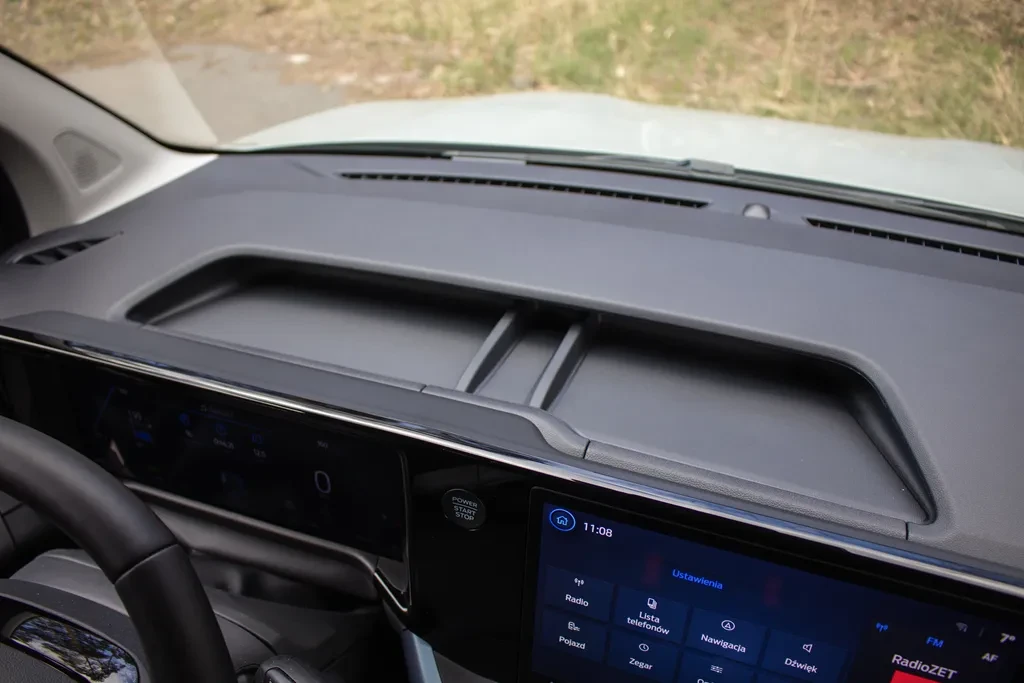 Sam projekt wnętrza zasługuje na pochwałę. Mamy dwa połączone ekrany, kierownicę, która bardzo dobrze leży w dłoniach, intuicyjną obsługę i sporo praktycznych rozwiązań — jak choćby półkę nad głowami pasażerów z przodu. Całość wyraźnie stawia na funkcjonalność.