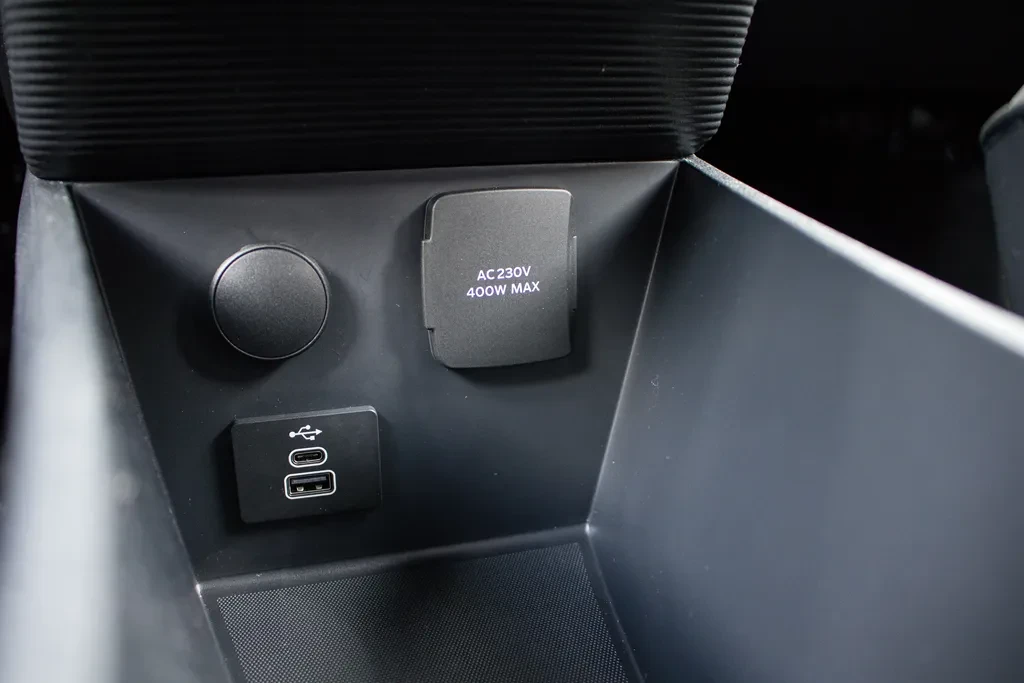 Na pokładzie nie brakuje też złączy — mamy USB typu A i USB typu C, gniazdo 12 V, a choćby 230 V, co w tej klasie auta naprawdę robi różnicę.
