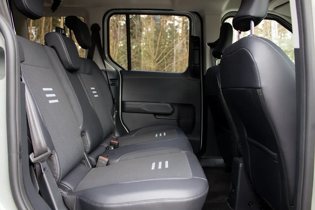 No dobra, przechodzimy dalej. Wskakujemy na tylny rząd — pomagają w tym przesuwne drzwi po obu stronach, które w codziennym użytkowaniu są po prostu genialne, zwłaszcza jeżeli macie dzieci. gwałtownie jednak okazuje się, iż E-Tourneo Courier nie jest dużym samochodem w klasycznym rozumieniu. Nad głową miejsca jest bardzo dużo, ale na nogi robi się już przeciętnie — szczególnie gdy z przodu siedzi wyższa osoba. W praktyce to przede wszystkim przestrzeń dla dzieci.