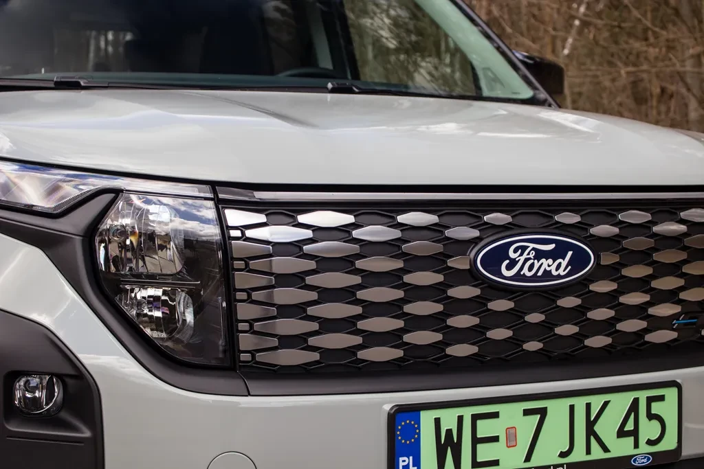 Ford E-Tourneo Courier różni się od wersji spalinowej przede wszystkim przodem. Mamy tu całkowicie przeprojektowaną atrapę chłodnicy z chromowanym wykończeniem i wypełnieniem w kształcie rombów, a także listwę świetlną biegnącą przez całą szerokość. Do tego dochodzą aerodynamiczne felgi, które podkreślają elektryczny charakter auta.