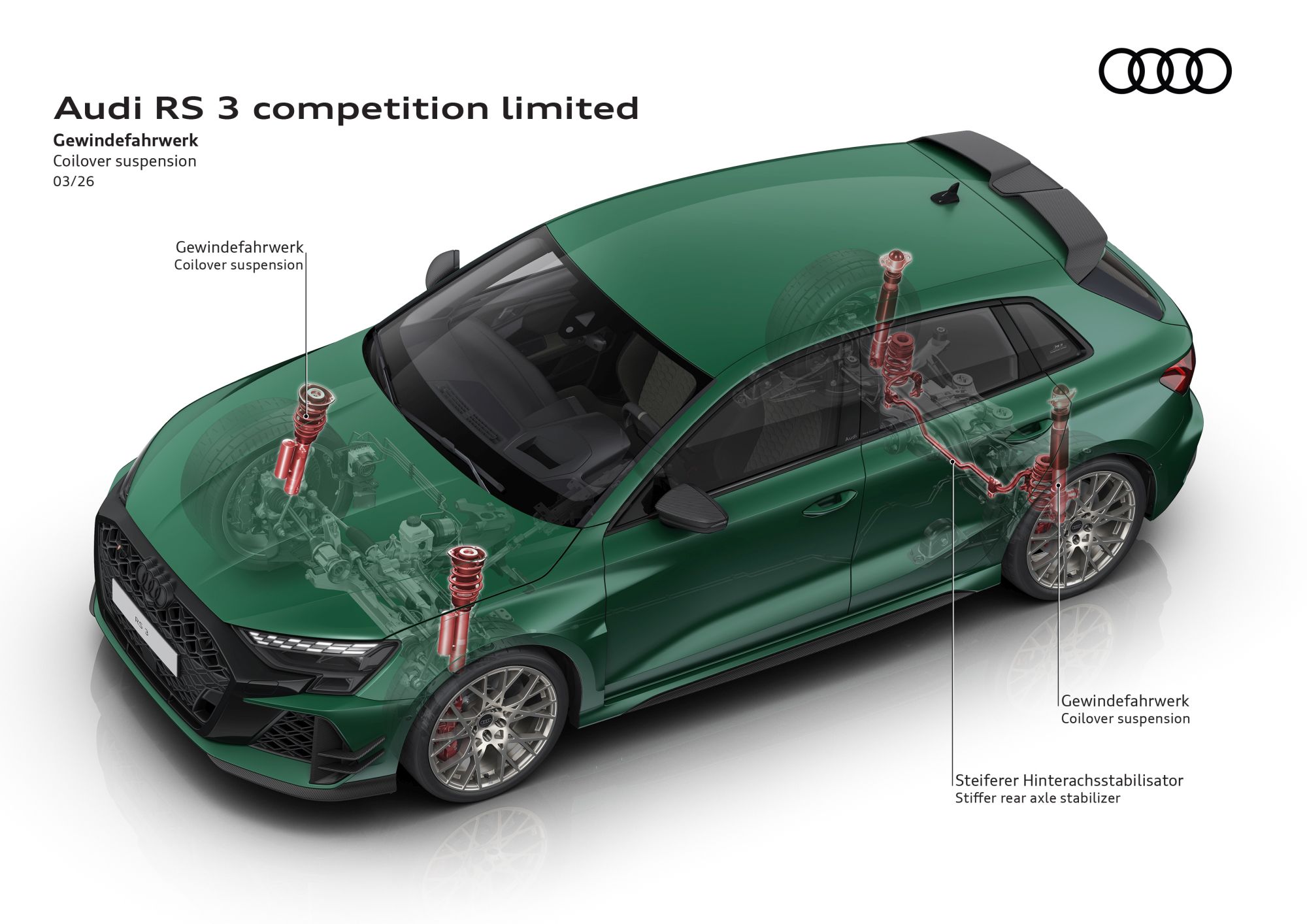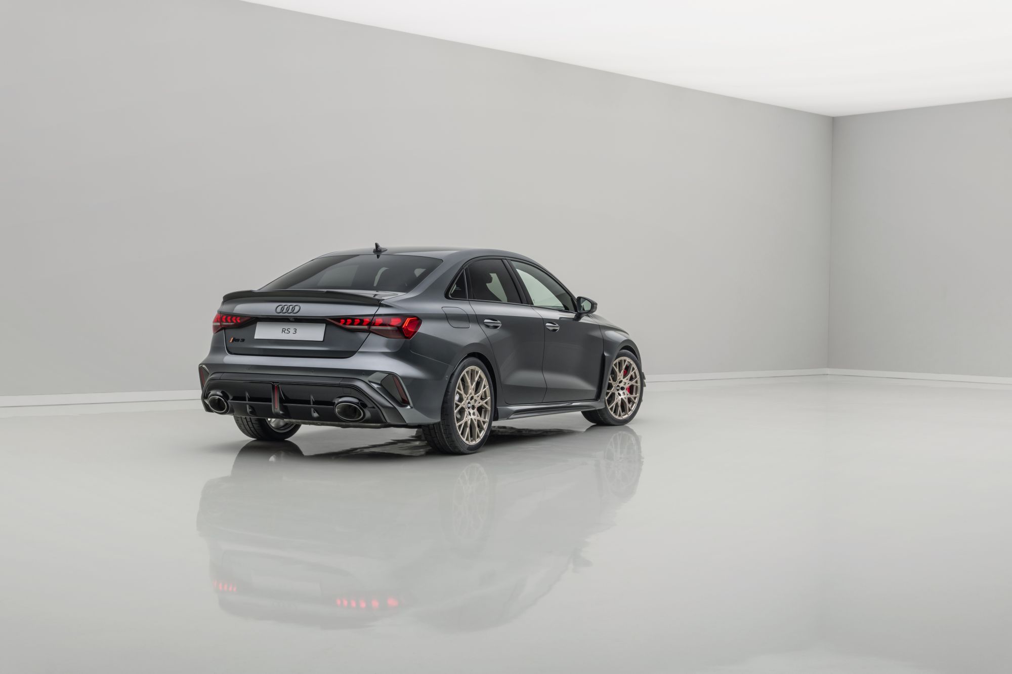 Wizualnie RS 3 competition limited stawia na surowy, techniczny styl. Nadwozie uzbrojono w liczne dodatki z matowego włókna węglowego (m.in. powiększony przedni splitter, prowadnice powietrza, progi, lusterka, tylny spojler i dyfuzor). W nadkolach znalazły się 19-calowe felgi polakierowane na kolor matowego, złotego neodymu. Ciekawym smaczkiem są matrycowe reflektory LED, które przy otwieraniu auta wyświetlają animację zgodną z kolejnością zapłonu cylindrów (1-2-4-5-3).